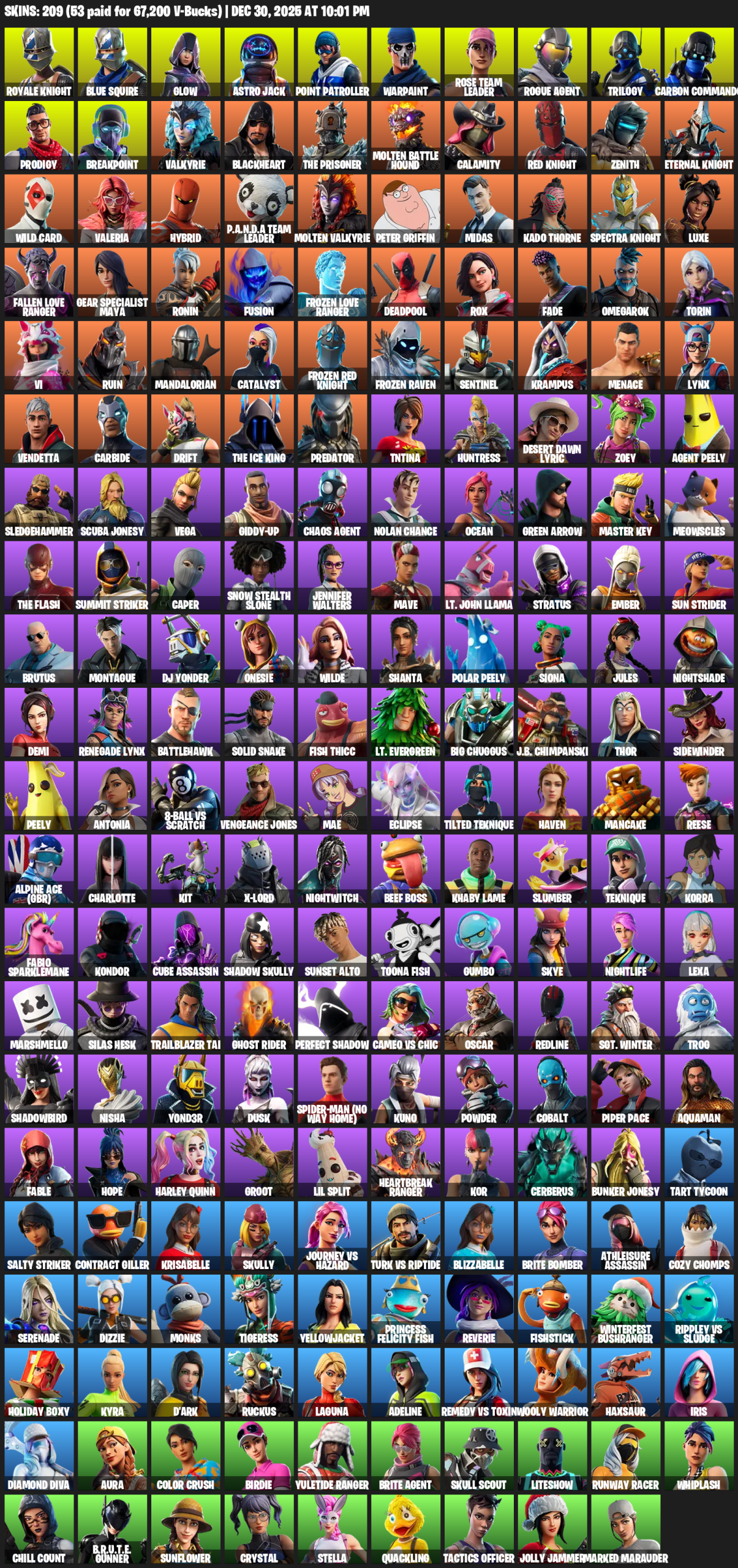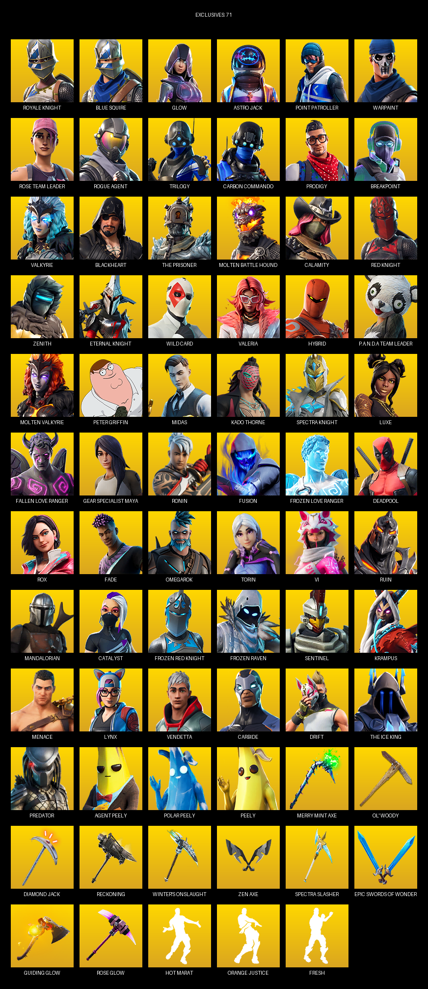 Royale Knight, Blue Squire, Point Patroller, Gear Specialist Maya, Glow, Astro Jack, Warpaint, Rose Team Leader, Rogue Agent, Trilogy, Carbon Commando, Prodigy, Breakpoint, Valkyrie, Blackheart, The Prisoner, Molten Battle Hound, Calamity, Zenith