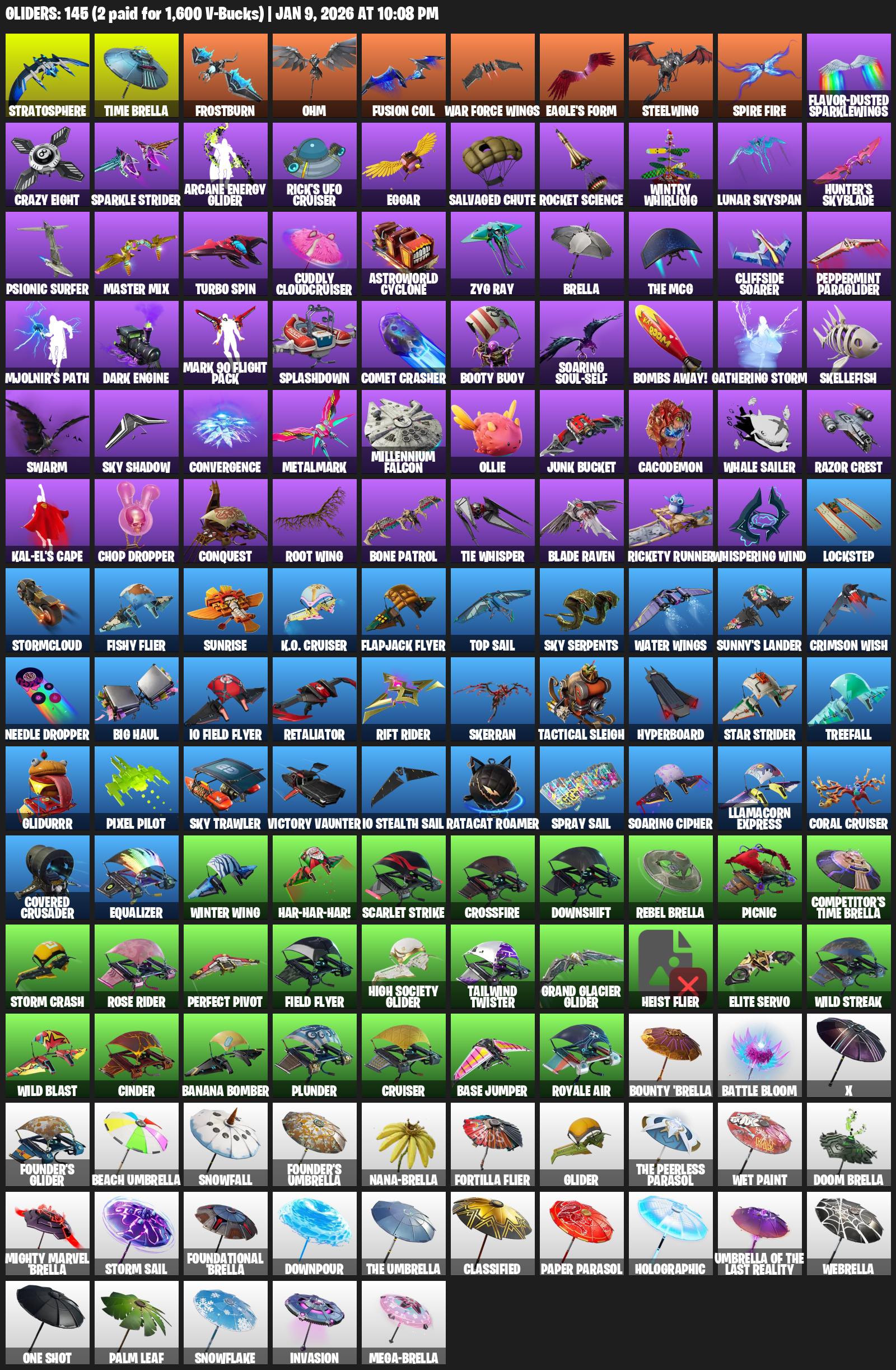 Stratosphere, Time Brella, Frostburn, Ohm, War Force Wings, Eagle’s Form, Steelwing, Spire Fire, Flavor-Dusted Sparklewings, Crazy Eight, Sparkle Strider, Arcane Energy Glider, Rick’s UFO Cruiser, Eggar, Salvaged Chute, Rocket Science, Wintry Whirligig, Lunar Skyspan, Hunter’s Skyblade