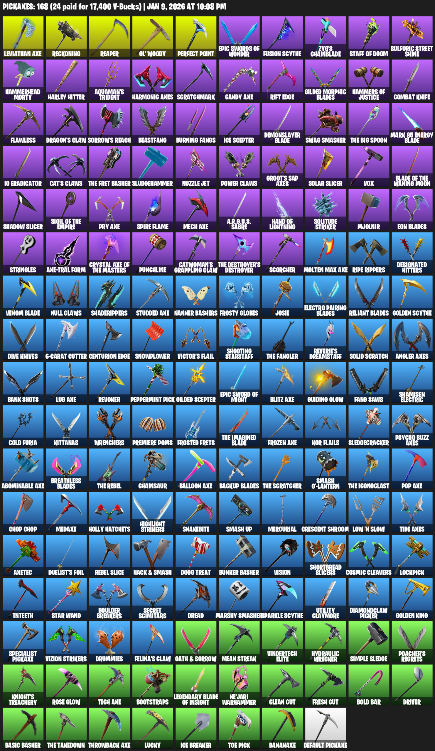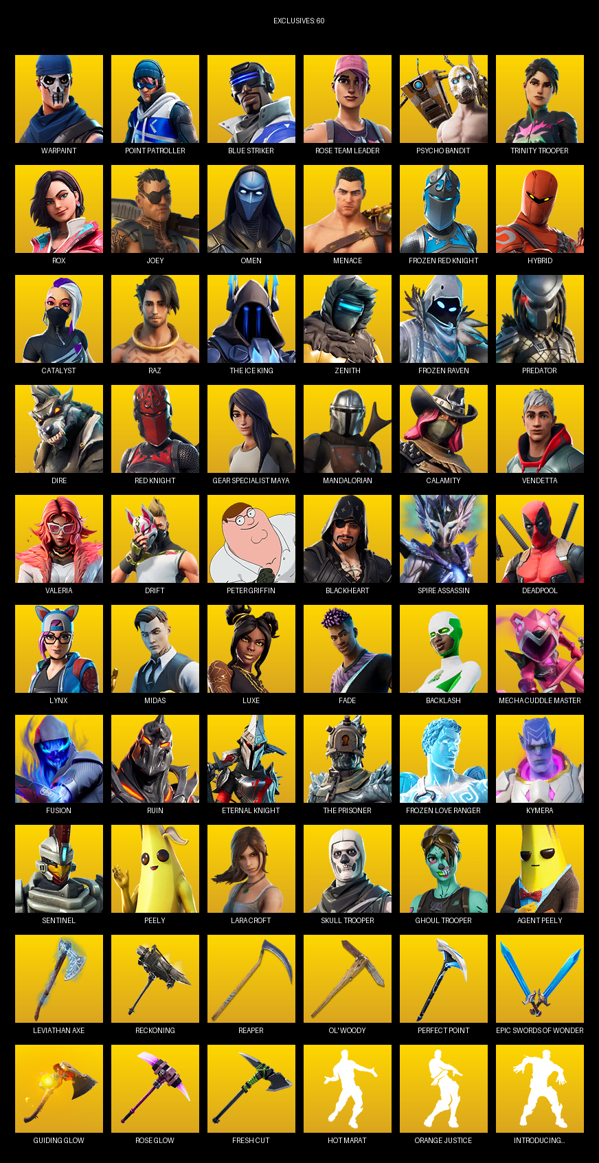 Leviathan Axe, Reckoning, Reaper, Ol’ Woody, Fusion Scythe, Zyg’s Chainblade, Staff of Doom, Sulfuric Street Shine, Hammerhead Morty, Harley Hitter, Aquaman’s Trident, Harmonic Axes, Scratchmark, Rift Edge, Gilded Morphic Blades, Combat Knife