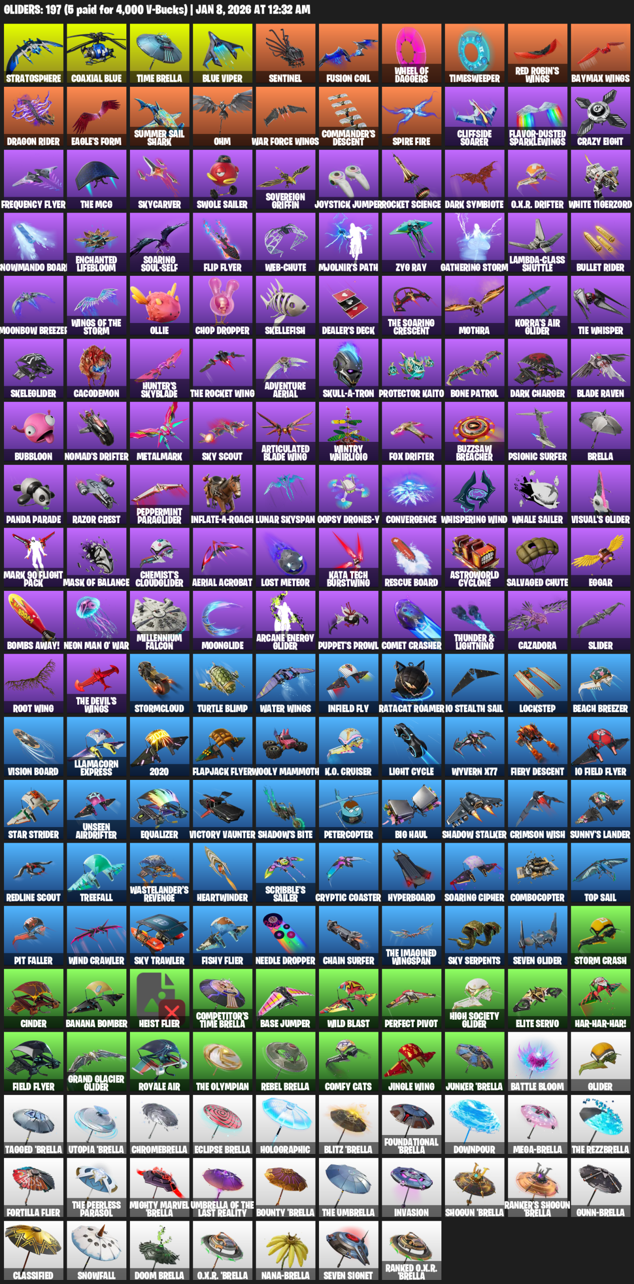 Stratosphere, Coaxial Blue, Time Brella, Sentinel, Timesweeper, Red Robin’s Wings, Dragon Rider, Eagle’s Form, Summer Sail Shark, Ohm, Commander’s Descent, Cliffside Soarer, Flavor-Dusted Sparklewings, Crazy Eight