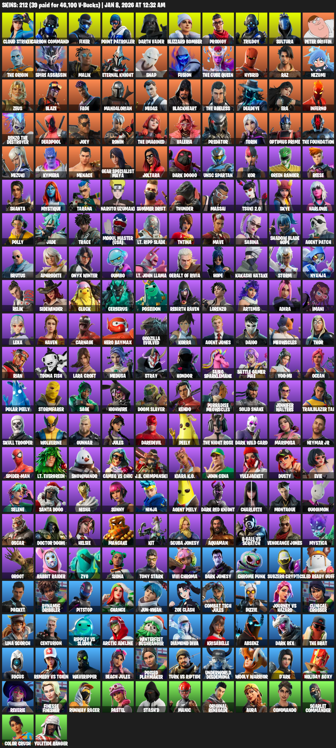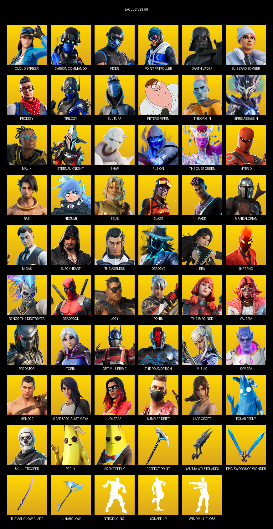 Point Patroller, Gear Specialist Maya, Lara Croft, Cloud Striker, Carbon Commando, Fixer, Darth Vader, Blizzard Bomber, Prodigy, Trilogy, Sultura, Peter Griffin, The Origin, Spire Assassin, Malik, Eternal Knight, Snap, Fusion, Hybrid