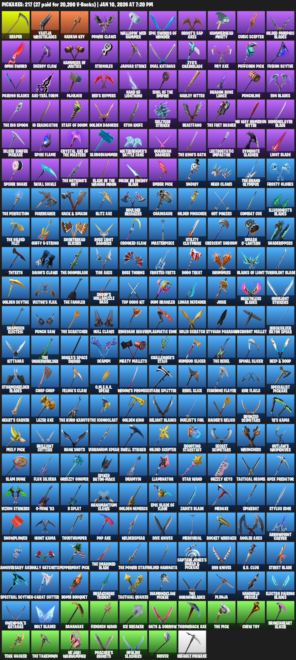 Reaper, Yautja Wristblades, Hadean Key, Power Claws, Wallopin’ Web Hammer, Groot’s Sap Axes, Hammerhead Morty, Cubic Scepter, Gilded Morphic Blades, Omni Sword, Energy Claw, Hammers of Justice, Stringles, Jaguar Strike, Dual Katanas, Zyg’s Chainblade, Pry Axe, Puffcorn Pick