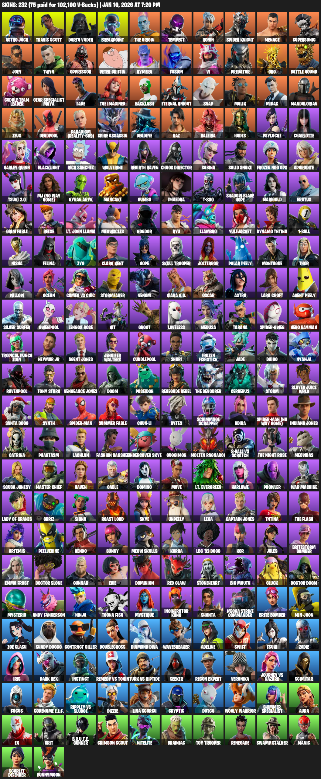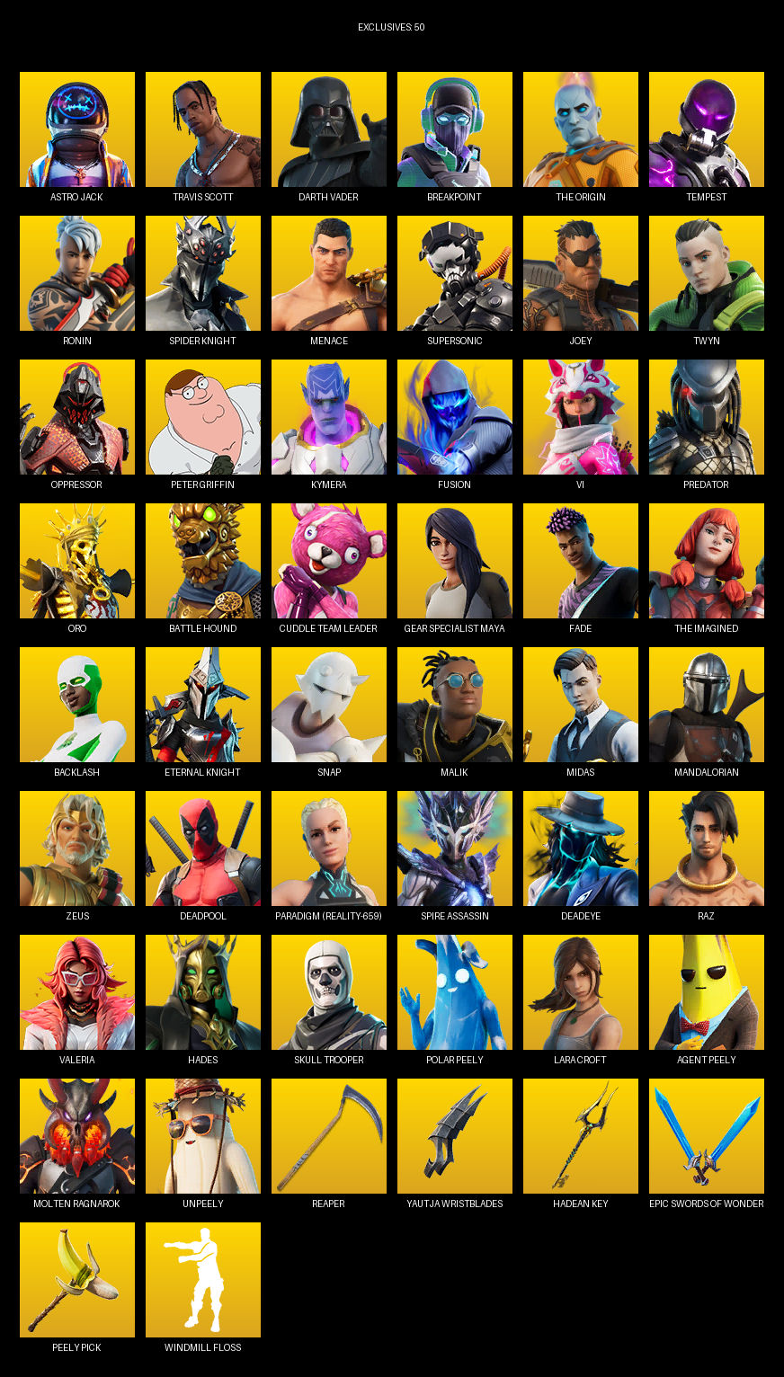 Travis Scott, Gear Specialist Maya, Lara Croft, Astro Jack, Darth Vader, Breakpoint, The Origin, Tempest, Ronin, Spider Knight, Menace, Supersonic, Joey, Twyn, Oppressor, Peter Griffin, Kymera, Fusion, Vi, Predator