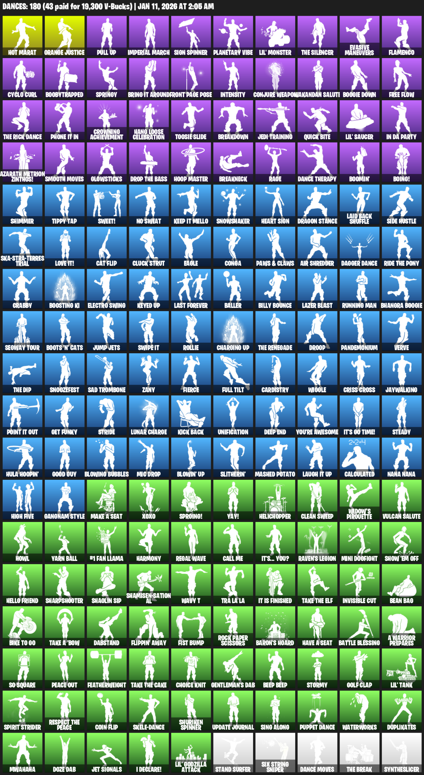Hot Marat, Orange Justice, Pull Up, Imperial March, Sign Spinner, Planetary Vibe, Lil’ Monster, Evasive Maneuvers, Flamenco, Cyclo Curl, Boobytrapped, Springy, Bring it around, Front Page Pose, Intensity, Conjure Weapon, Wakandan Salute, Boogie Down, Free Flow