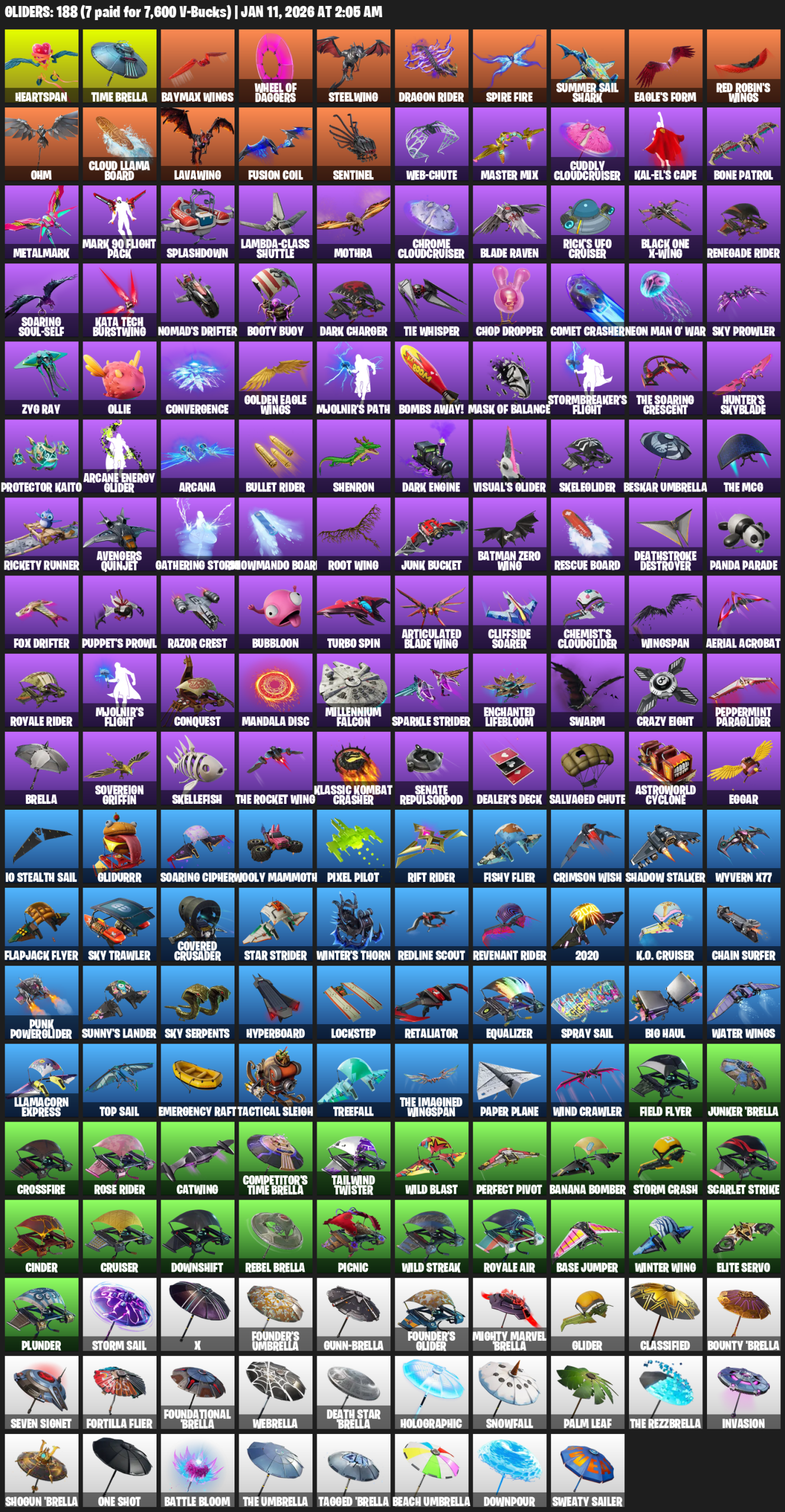 Heartspan, Time Brella, Baymax Wings, Wheel of Daggers, Steelwing, Dragon Rider, Spire Fire, Summer Sail Shark, Eagle’s Form, Ohm, Cloud Llama Board, Lavawing, Fusion Coil, Sentinel, Master Mix, Cuddly Cloudcruiser, Kal-El’s Cape, Bone Patrol