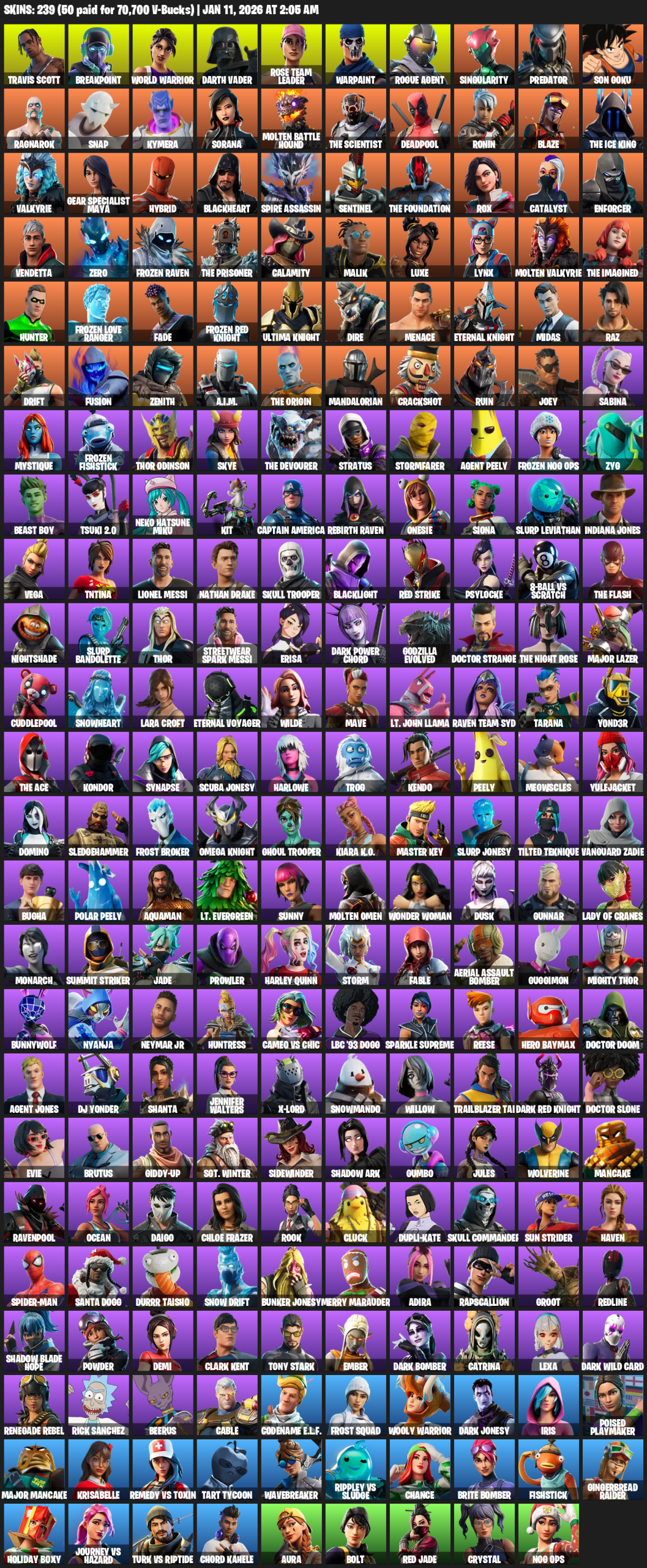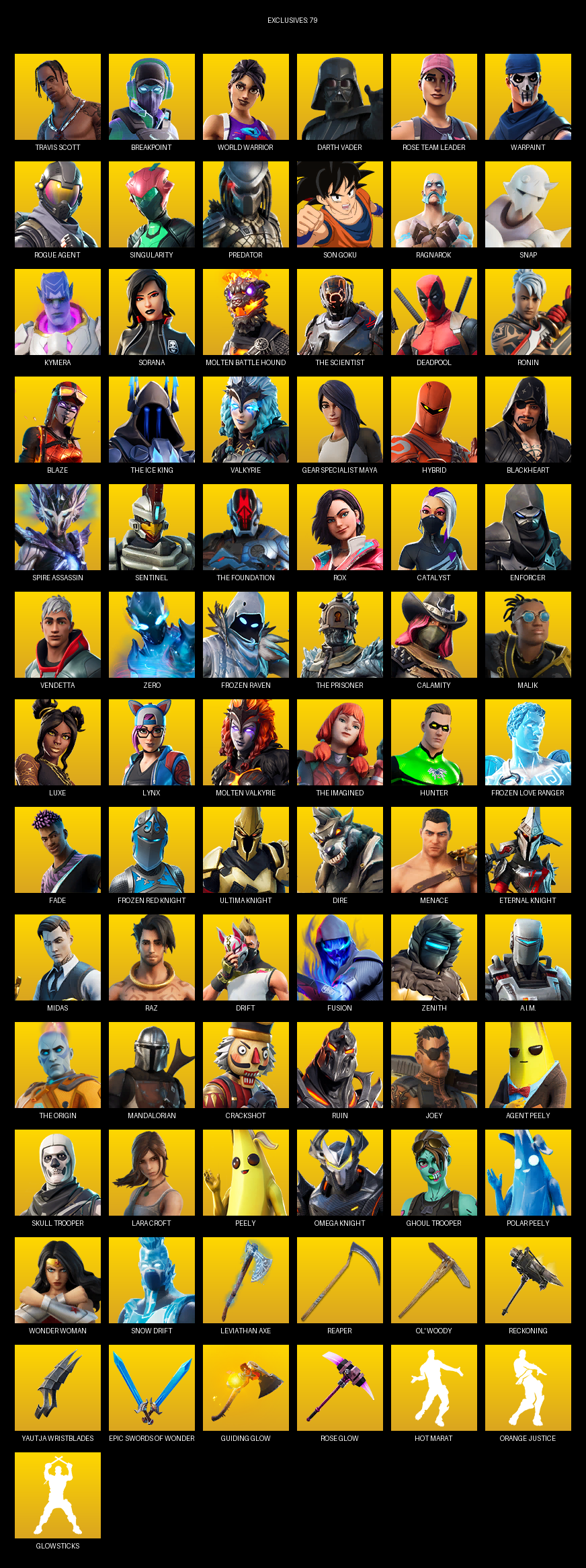 Travis Scott, Gear Specialist Maya, Lara Croft, Breakpoint, World Warrior, Darth Vader, Rose Team Leader, Warpaint, Rogue Agent, Singularity, Predator, Son Goku, Ragnarok, Snap, Kymera, Sorana, Molten Battle Hound, The Scientist, Deadpool, Ronin