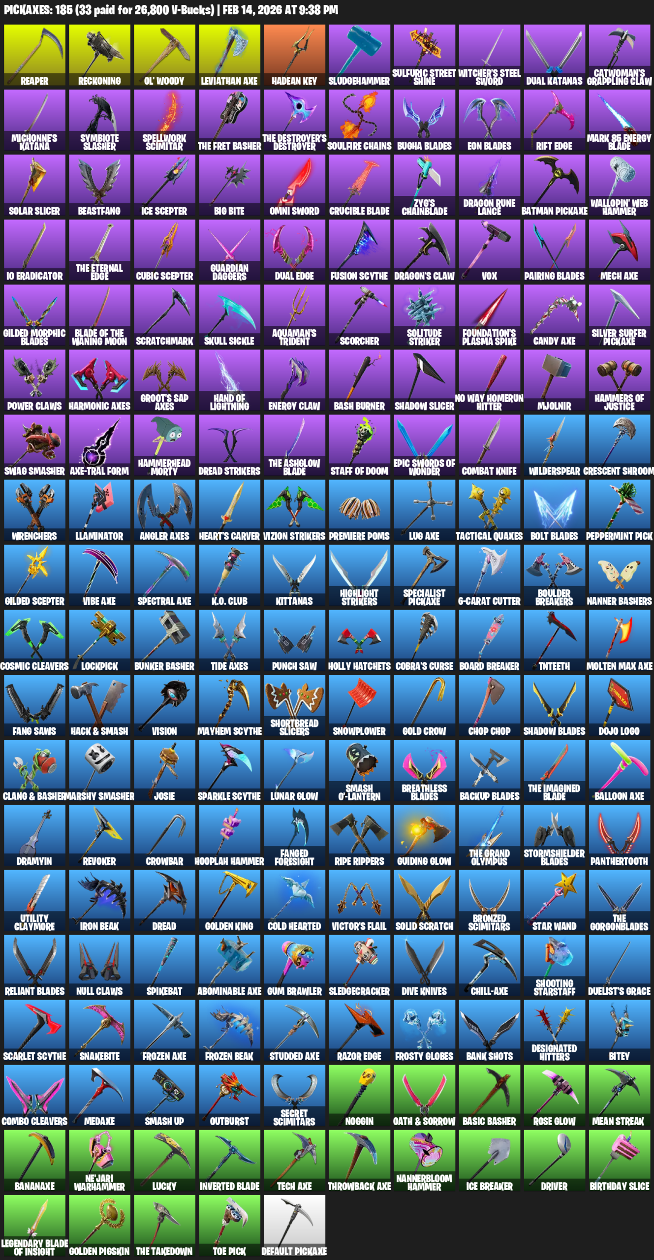 Leviathan Axe, Reaper, Reckoning, Ol’ Woody, Hadean Key, Sludgehammer, Sulfuric Street Shine, Witcher’s Steel Sword, Dual Katanas, Catwoman’s Grappling Claw, Michonne’s Katana, Symbiote Slasher, Spellwork Scimitar, Soulfire Chains, Bugha Blades, Rift Edge, Mark 85 Energy Blade