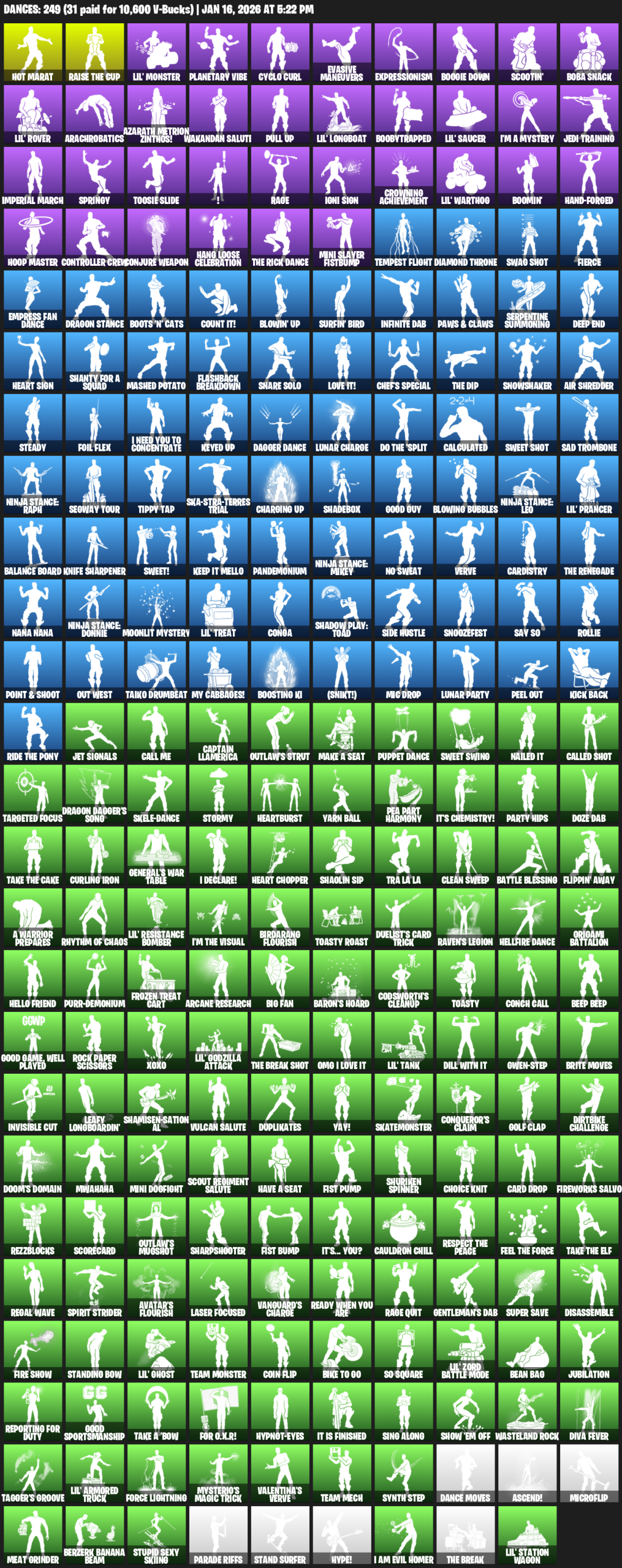 Hot Marat, Lil’ Monster, Planetary Vibe, Cyclo Curl, Evasive Maneuvers, Expressionism, Boogie Down, Scootin’, Boba Snack, Arachrobatics, Azarath Metrion Zinthos!, Wakandan Salute, Pull Up, Boobytrapped, I’m a Mystery, Jedi Training
