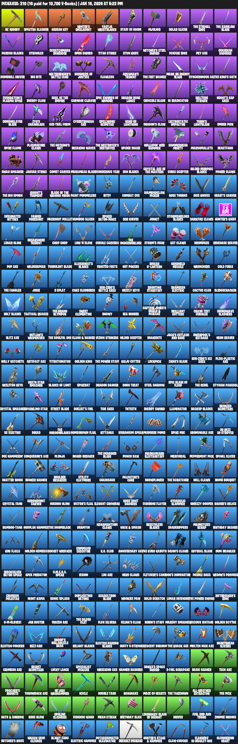 Ol’ Woody, Spectra Slasher, Hadean Key, Winter’s Onslaught, Yautja Wristblades, Staff of Doom, Mjolnir, Solar Slicer, Pairing Blades, Stringles, Scratchmark Shredder, Omni Sword, Titan Strike, Stun Knife, Foxfire Edge, Pry Axe, Guardian Daggers
