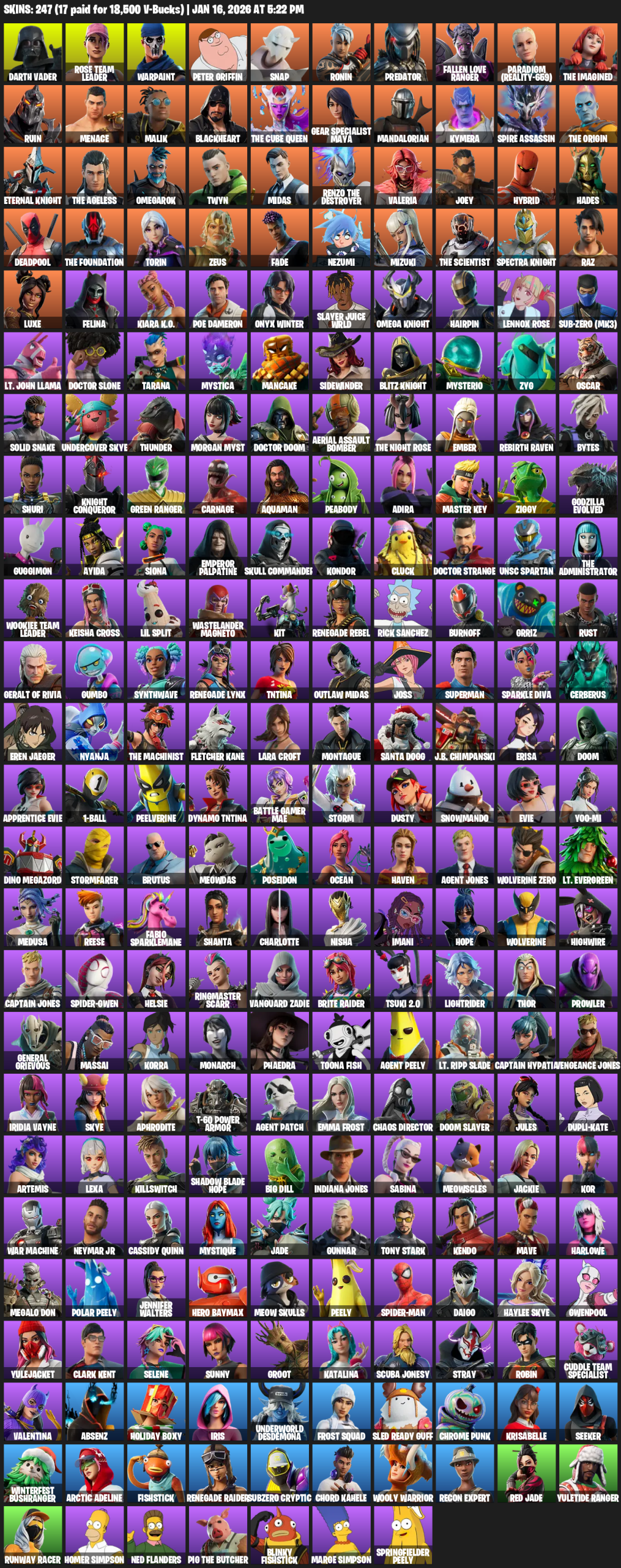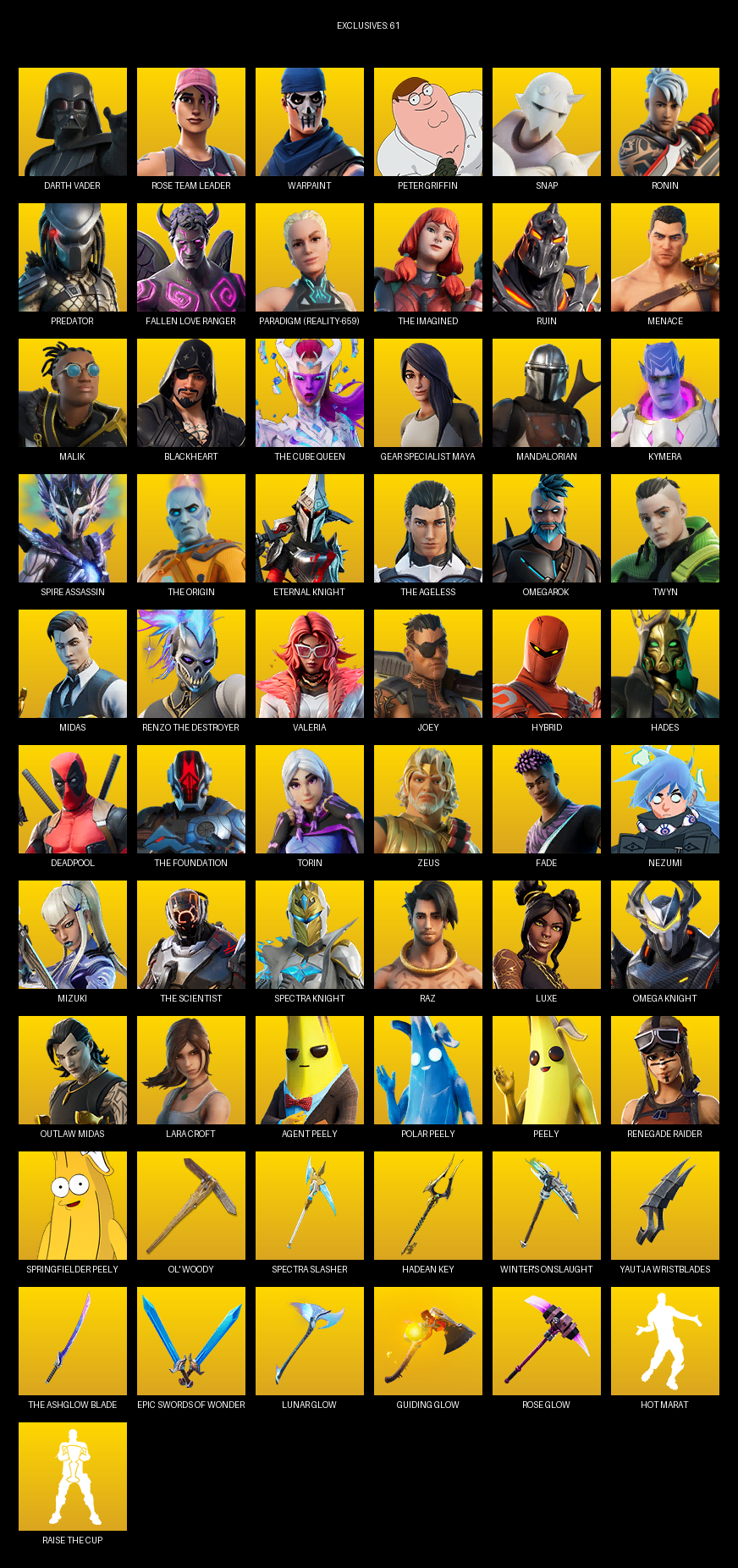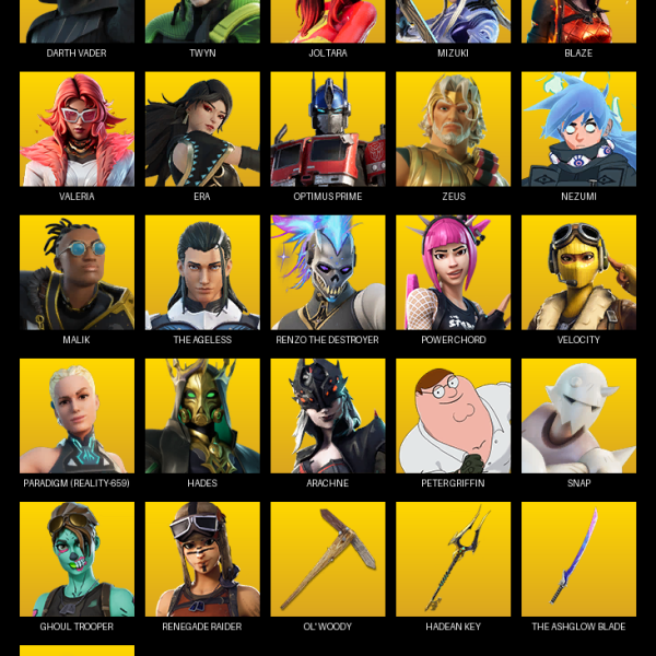 Gear Specialist Maya, Lara Croft, Renegade Raider, Darth Vader, Rose Team Leader, Warpaint, Peter Griffin, Snap, Ronin, Predator, Fallen Love Ranger, Paradigm (Reality-659), The Imagined, Ruin, Menace, Malik, Blackheart, Mandalorian, Kymera