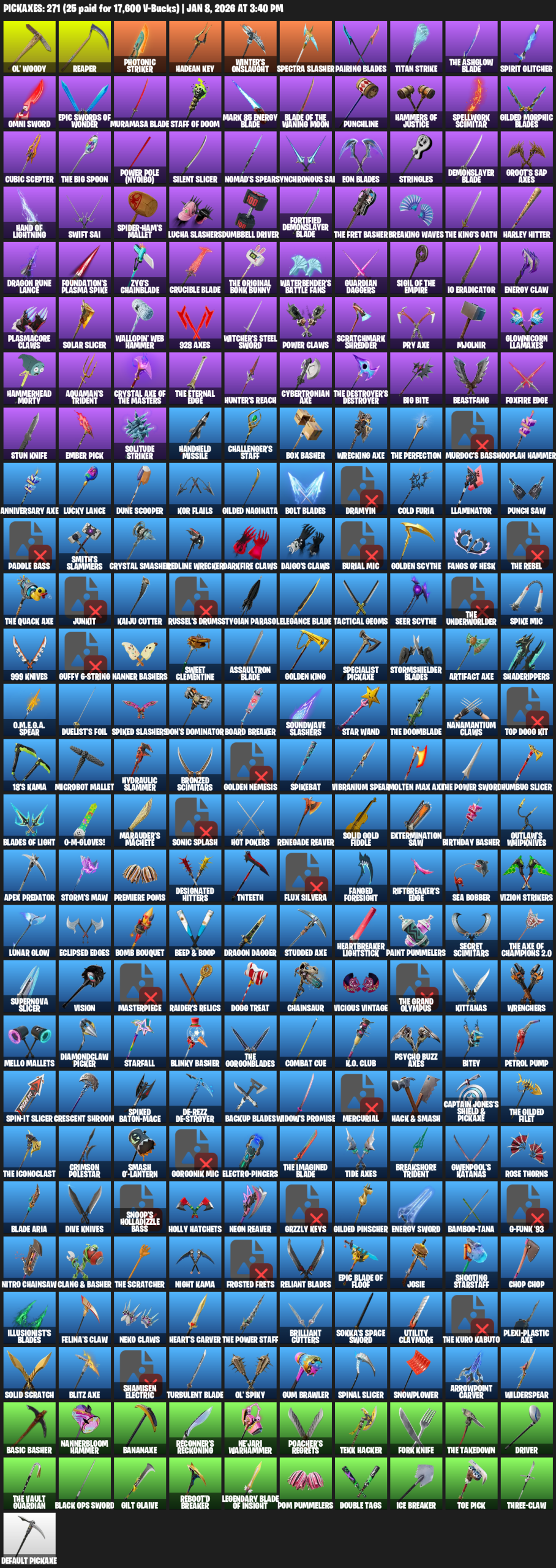 Ol’ Woody, Reaper, Photonic Striker, Hadean Key, Winter’s Onslaught, Spectra Slasher, Pairing Blades, Titan Strike, The Ashglow Blade, Spirit Glitcher, Omni Sword, Staff of Doom, Punchline, Spellwork Scimitar