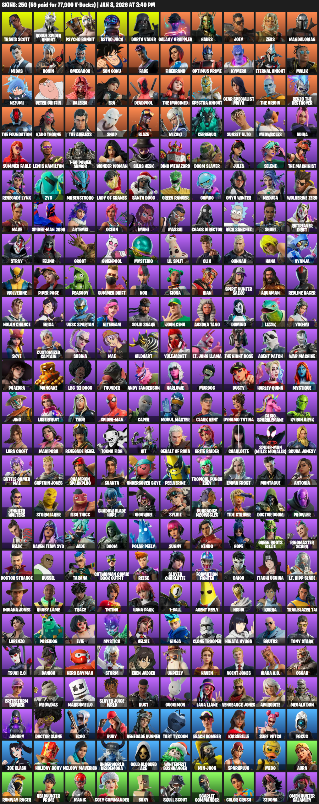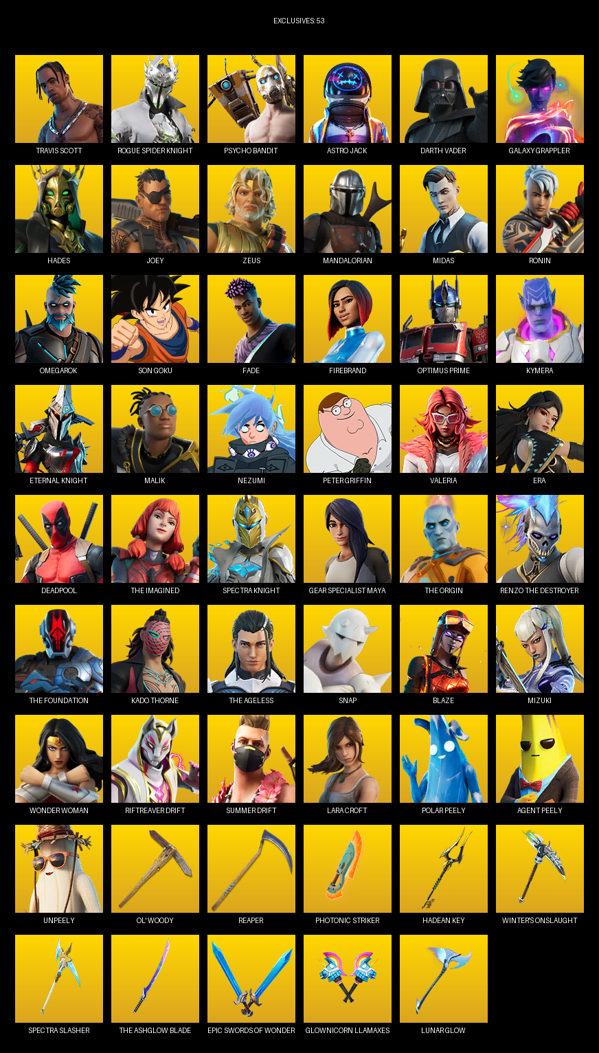Travis Scott, Gear Specialist Maya, Lara Croft, Rogue Spider Knight, Psycho Bandit, Astro Jack, Darth Vader, Galaxy Grappler, Hades, Joey, Zeus, Mandalorian, Midas, Ronin, Omegarok, Son Goku, Fade, Firebrand, Optimus Prime, Kymera