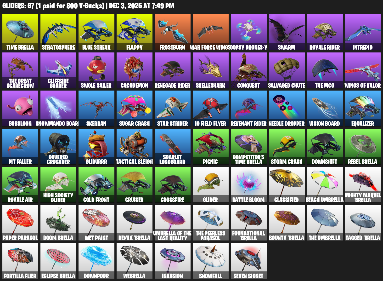 Time Brella, Stratosphere, Flappy, Frostburn, War Force Wings, Oopsy Drones-y, Swarm, Royale Rider, Intrepid, Cliffside Soarer, Swole Sailer, Cacodemon, Skelleshark, Conquest, Salvaged Chute