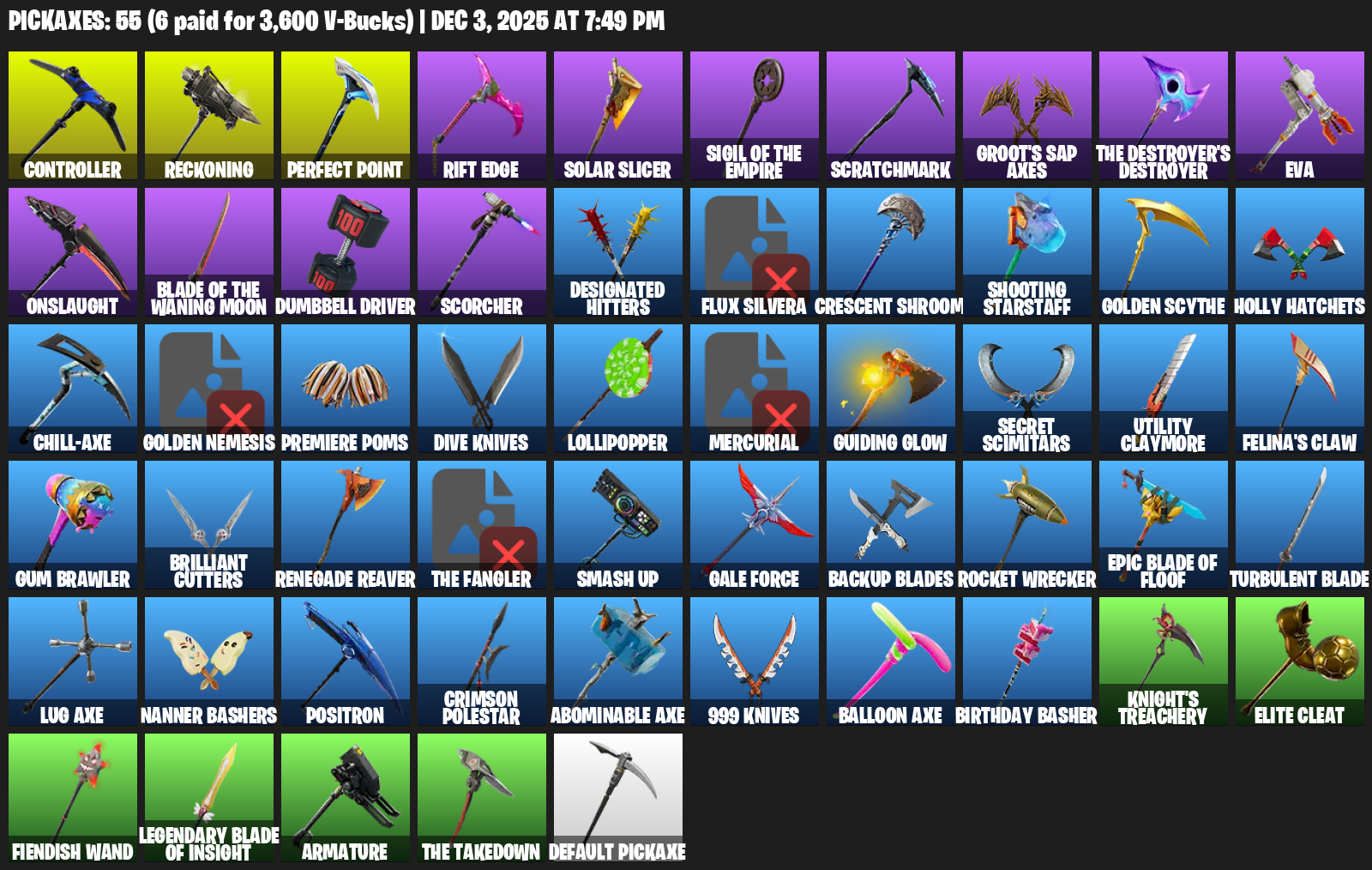 Controller, Reckoning, Perfect Point, Rift Edge, Solar Slicer, Scratchmark, Groot’s Sap Axes, EVA, Onslaught, Dumbbell Driver, Scorcher, Designated Hitters, Flux Silvera, Crescent Shroom, Shooting Starstaff, Golden Scythe, Holly Hatchets
