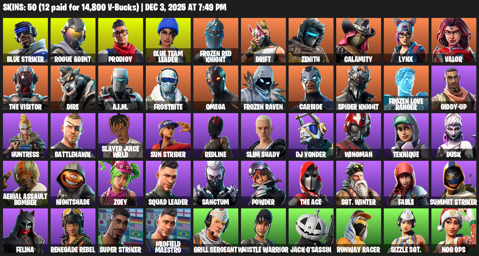 Omega, Blue Striker, Rogue Agent, Prodigy, Frozen Red Knight, Drift, Zenith, Calamity, Lynx, Valor, The Visitor, Dire, A.I.M., Frostbite, Carbide, Giddy-up