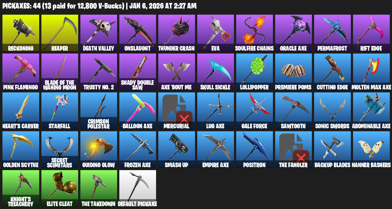 Reckoning, Death Valley, Onslaught, Thunder Crash, EVA, Soulfire Chains, Oracle Axe, Permafrost, Rift Edge, Pink Flamingo, Trusty No. 2, Shady Double Saw, Skull Sickle, Lollipopper, Premiere Poms