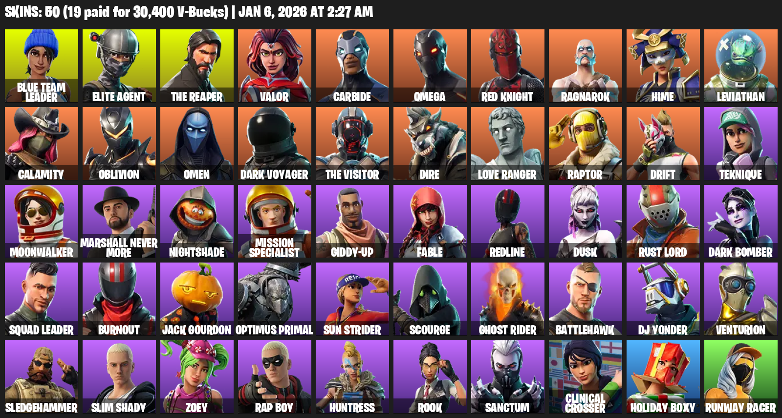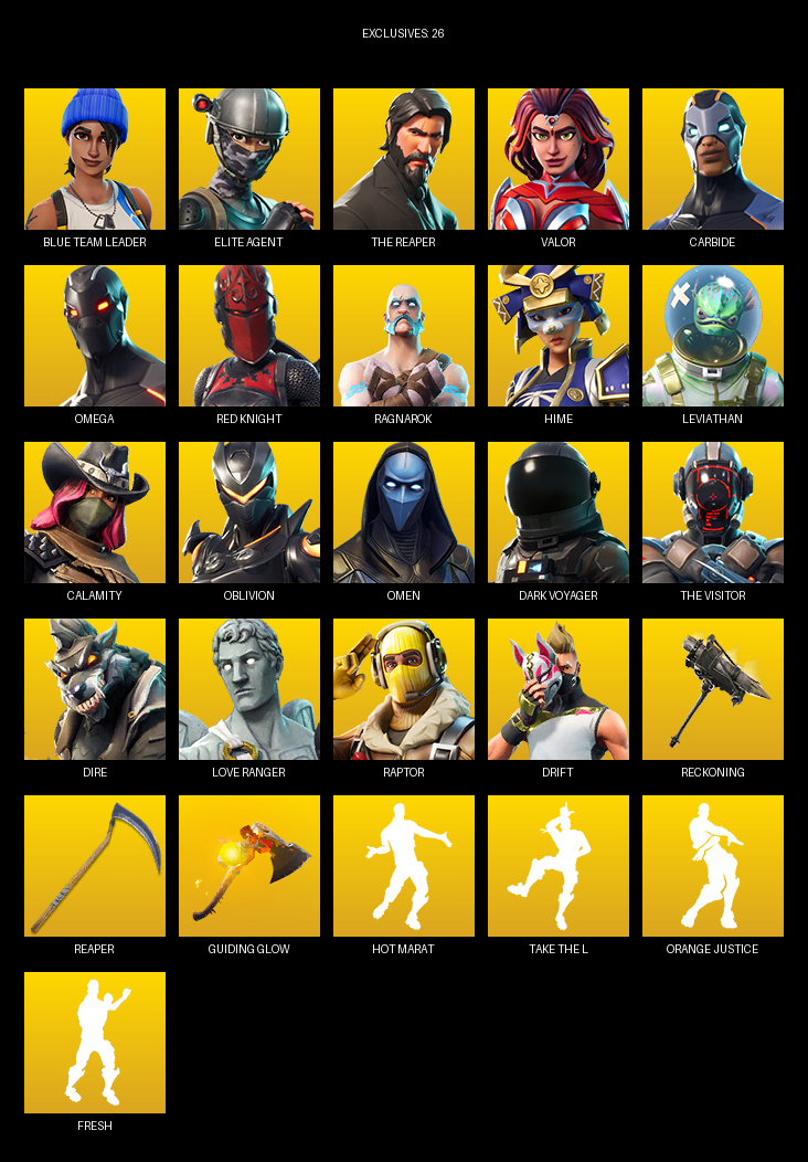 Elite Agent, The Reaper, Omega, Blue Team Leader, Valor, Carbide, Red Knight, Ragnarok, Hime, Leviathan, Calamity, Oblivion, Omen, Dark Voyager, Dire, Love Ranger, Raptor, Drift, Teknique
