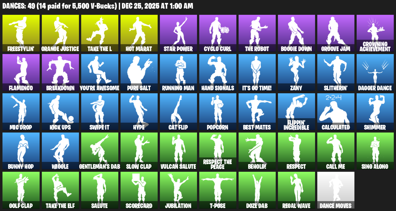 Hot Marat, Freestylin’, Orange Justice, Star Power, Cyclo Curl, Boogie Down, Groove Jam, Crowning Achievement, Flamenco, Breakdown, You’re Awesome, Pure Salt, Running Man, Hand Signals, It’s Go Time!, Zany, Slitherin’, Dagger Dance
