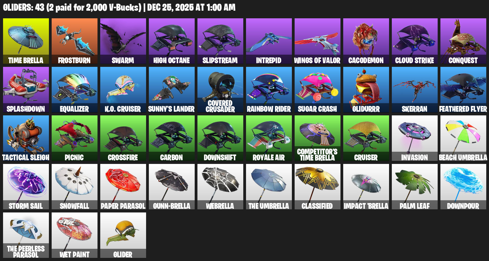 Time Brella, Frostburn, Swarm, High Octane, Slipstream, Intrepid, Cacodemon, Cloud Strike, Conquest, Splashdown, Equalizer, K.O. Cruiser, Sunny’s Lander, Covered Crusader, Sugar Crash, Glidurrr, Skerran, Feathered Flyer