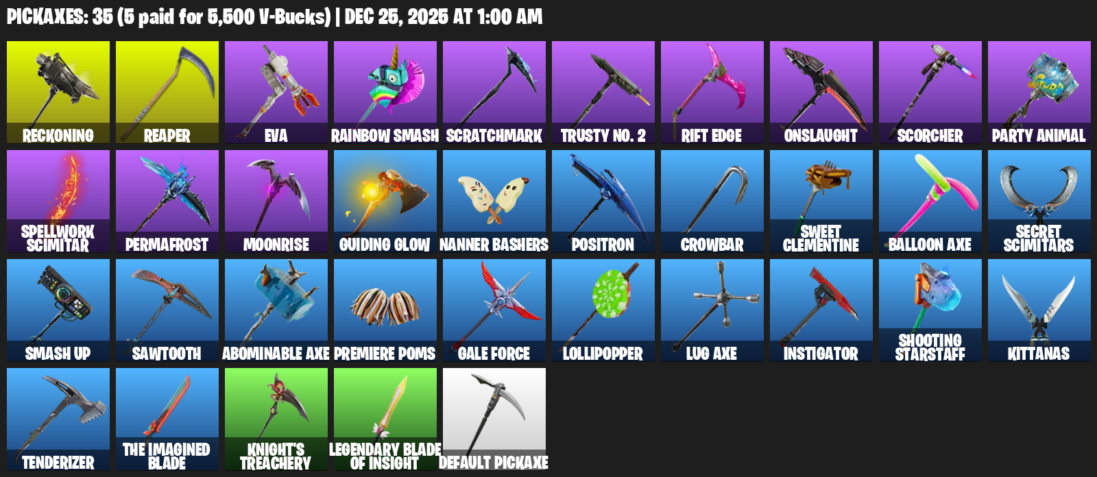 Reckoning, EVA, Rainbow Smash, Scratchmark, Trusty No. 2, Rift Edge, Onslaught, Scorcher, Party Animal, Spellwork Scimitar, Permafrost, Moonrise, Guiding Glow, Nanner Bashers, Positron, Crowbar, Sweet Clementine, Balloon Axe, Secret Scimitars