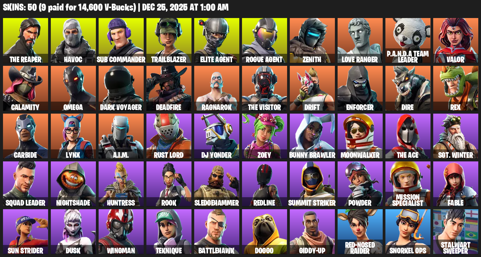 The Reaper, Elite Agent, Omega, Havoc, Sub Commander, Trailblazer, Zenith, Love Ranger, P.A.N.D.A Team Leader, Valor, Calamity, Dark Voyager, Deadfire, Ragnarok, Drift, Enforcer, Dire, Rex