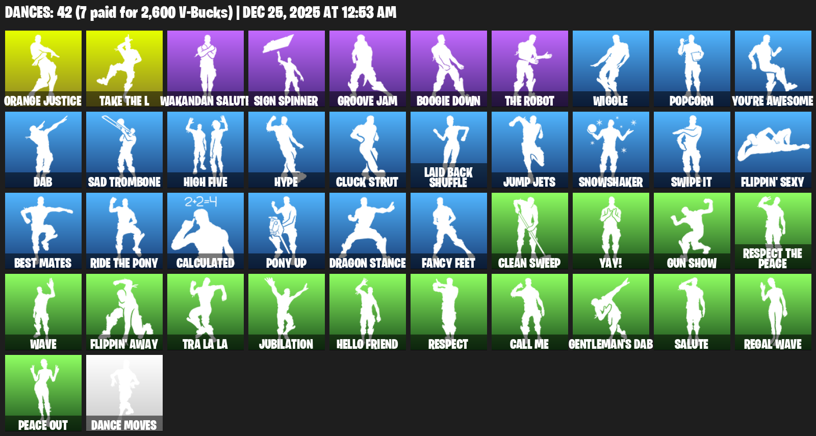 Orange Justice, Wakandan Salute, Sign Spinner, Groove Jam, Boogie Down, Wiggle, Popcorn, You’re Awesome, Dab, Sad Trombone, High Five, Hype, Cluck Strut, Laid Back Shuffle, Jump Jets, Snowshaker, Swipe It, Flippin’ Sexy