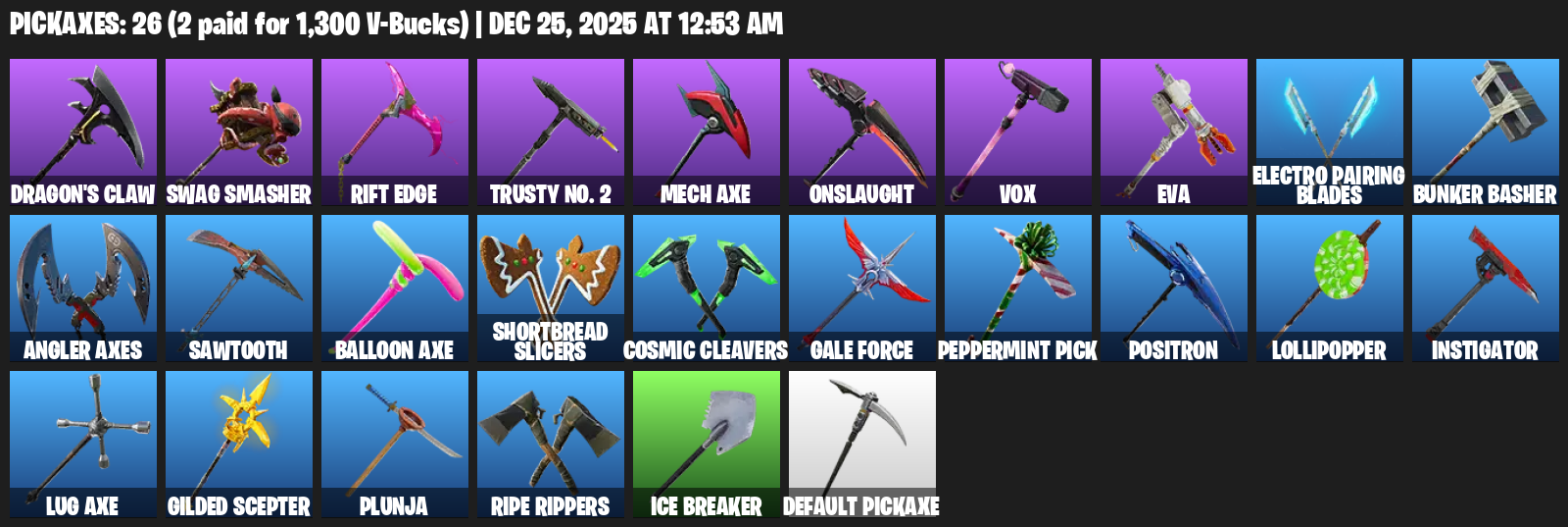 Dragon’s Claw, Swag Smasher, Rift Edge, Trusty No. 2, Mech Axe, Onslaught, Vox, EVA, Electro Pairing Blades, Bunker Basher, Angler Axes, Sawtooth, Shortbread Slicers, Cosmic Cleavers, Gale Force, Peppermint Pick, Positron, Lollipopper, Instigator