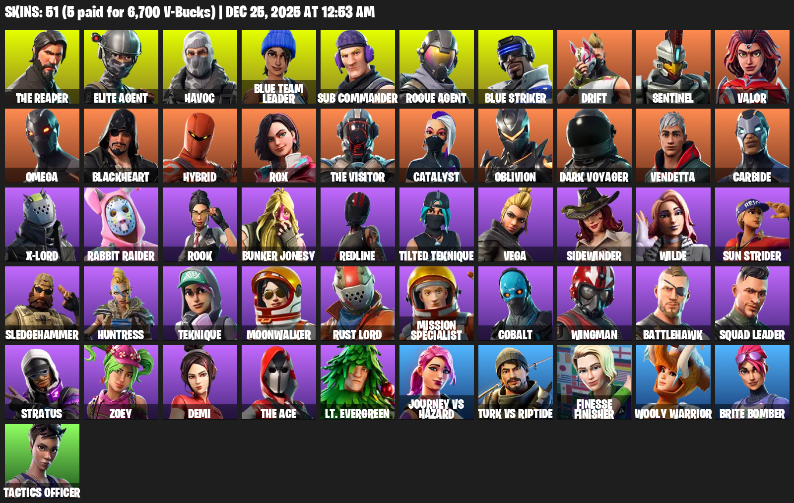 The Reaper, Elite Agent, Omega, Havoc, Blue Team Leader, Sub Commander, Drift, Sentinel, Valor, Blackheart, Hybrid, Rox, Catalyst, Oblivion, Dark Voyager, Vendetta, Carbide