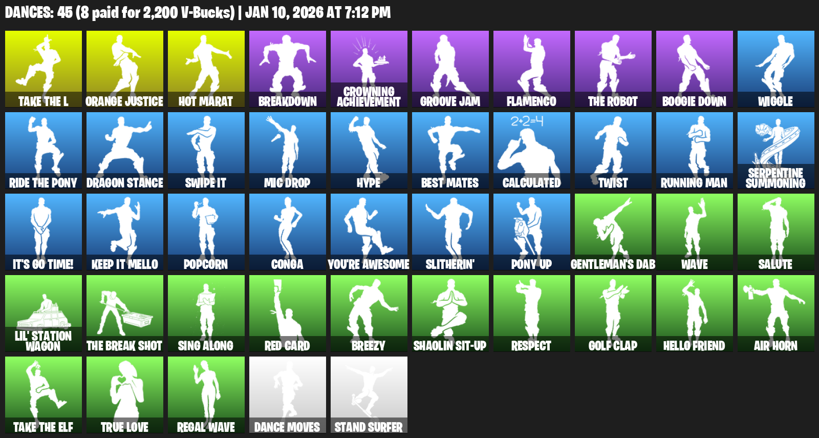 Hot Marat, Orange Justice, Breakdown, Crowning Achievement, Groove Jam, Flamenco, Boogie Down, Wiggle, Dragon Stance, Swipe It, Mic Drop, Hype, Best Mates, Calculated, Twist, Running Man, Serpentine Summoning