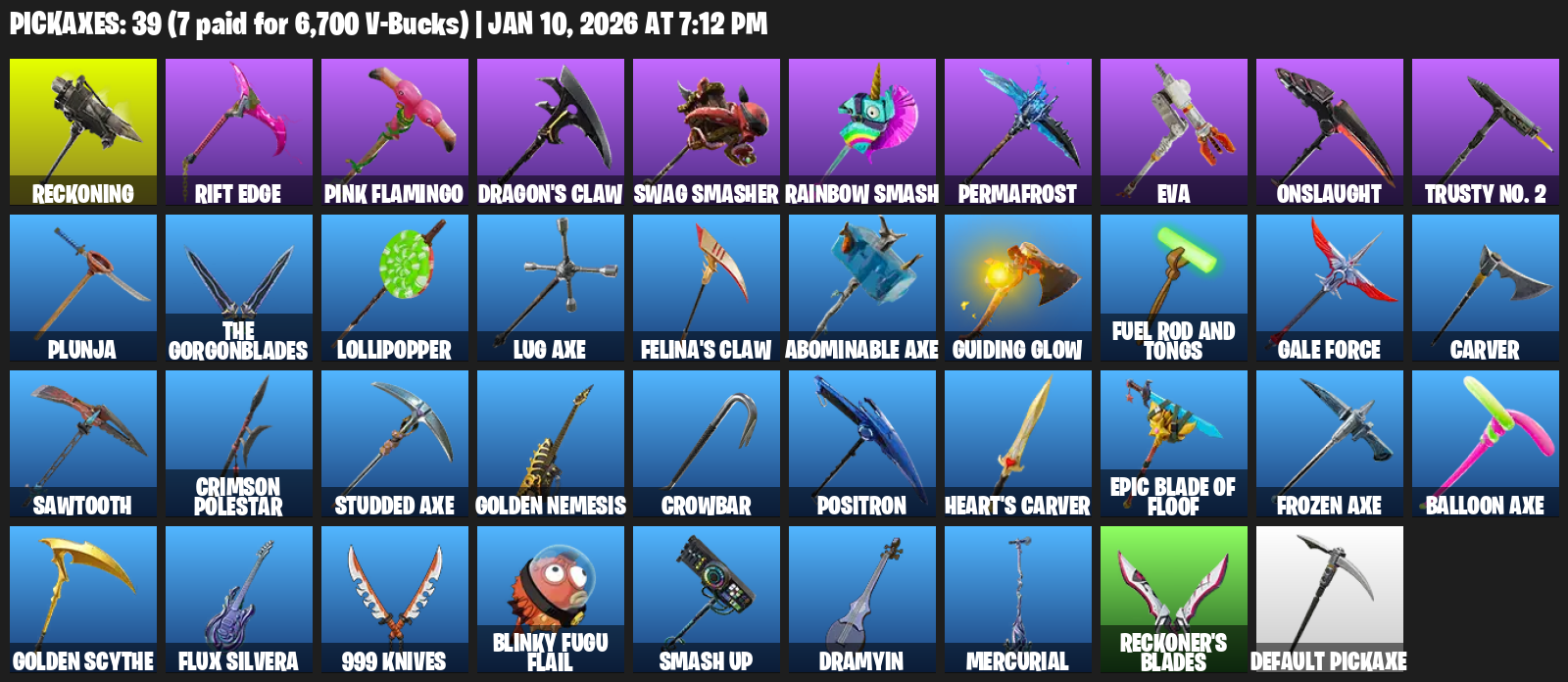 Reckoning, Rift Edge, Pink Flamingo, Dragon’s Claw, Swag Smasher, Rainbow Smash, Permafrost, EVA, Onslaught, Trusty No. 2, Plunja, Lollipopper, Lug Axe, Guiding Glow, Fuel Rod and Tongs, Gale Force, Carver