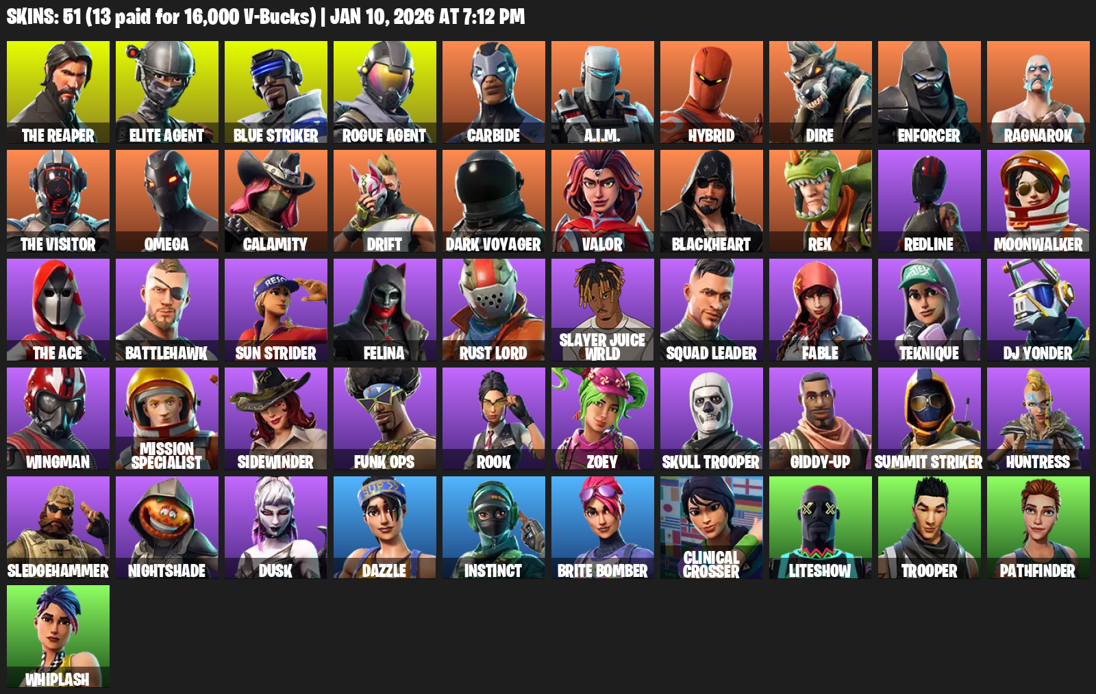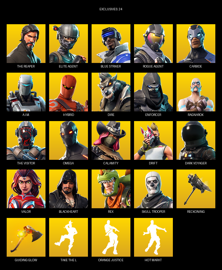 The Reaper, Elite Agent, Omega, Blue Striker, Carbide, A.I.M., Hybrid, Dire, Enforcer, Ragnarok, Calamity, Drift, Dark Voyager, Valor, Blackheart, Rex, Redline, Moonwalker