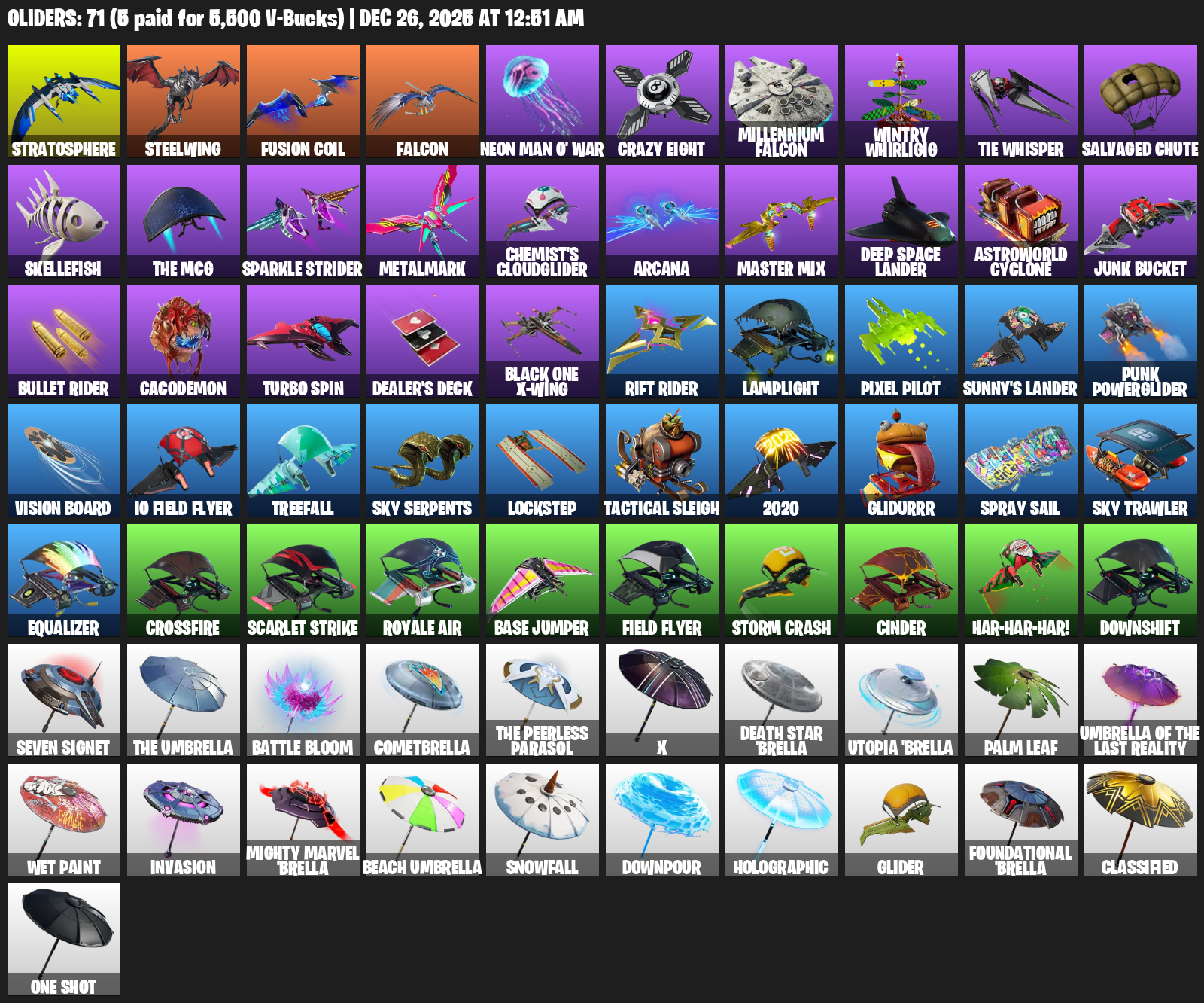Stratosphere, Steelwing, Falcon, Neon Man O’ War, Crazy Eight, Wintry Whirligig, TIE Whisper, Salvaged Chute, Skellefish, Metalmark, Chemist’s Cloudglider, Arcana, Master Mix, Deep Space Lander, Astroworld Cyclone, Junk Bucket