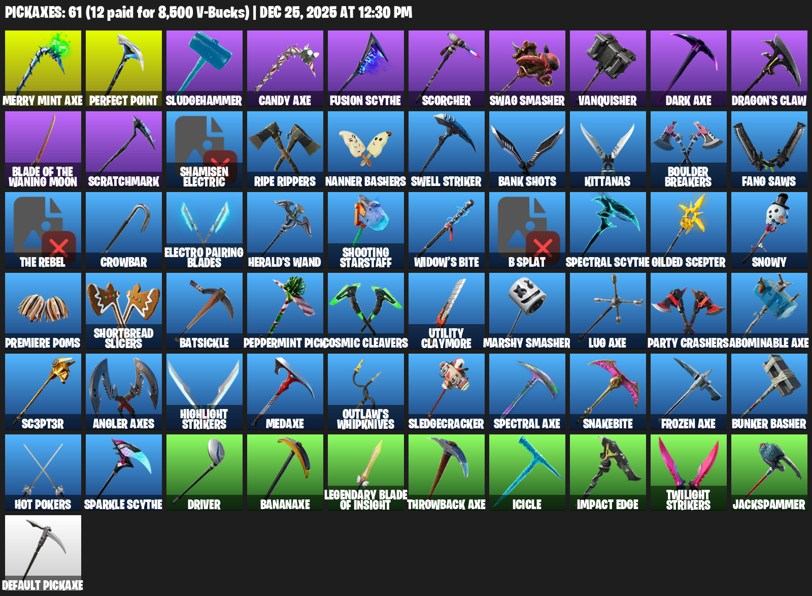 Merry Mint Axe, Perfect Point, Sludgehammer, Scorcher, Swag Smasher, Vanquisher, Dragon’s Claw, Scratchmark, Shamisen Electric, Ripe Rippers, Nanner Bashers, Swell Striker, Bank Shots, Kittanas, Boulder Breakers, Fang Saws