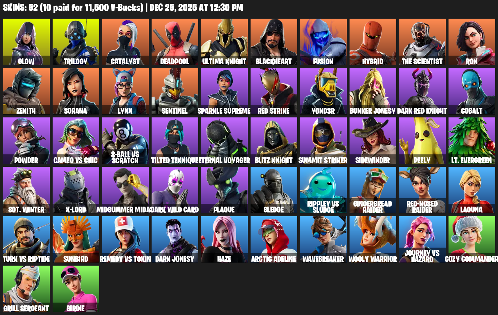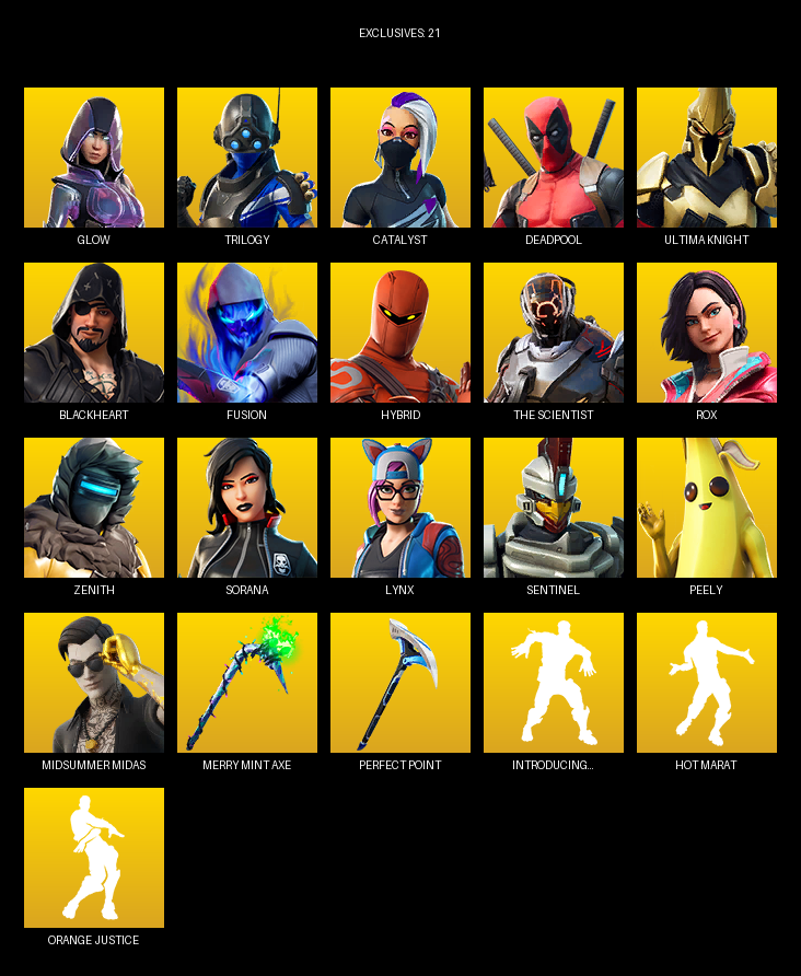 [PC/XBOX] | 52 skins | Merry Mint Axe | Glow | Trilogy | Catalyst | Deadpool | Ultima Knight | Blackheart | Fusion | Hybrid | The Scientist | #RFO2402