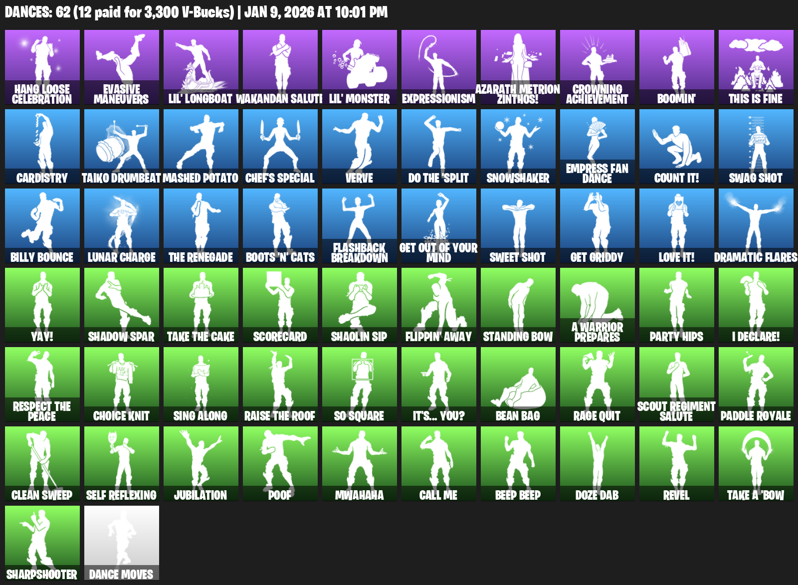 Hang Loose Celebration, Evasive Maneuvers, Lil’ Longboat, Wakandan Salute, Expressionism, Azarath Metrion Zinthos!, Crowning Achievement, Boomin’, This is Fine, Cardistry, Taiko Drumbeat, Mashed Potato, Chef’s Special, Verve, Snowshaker, Empress Fan Dance, Count It!, Swag Shot