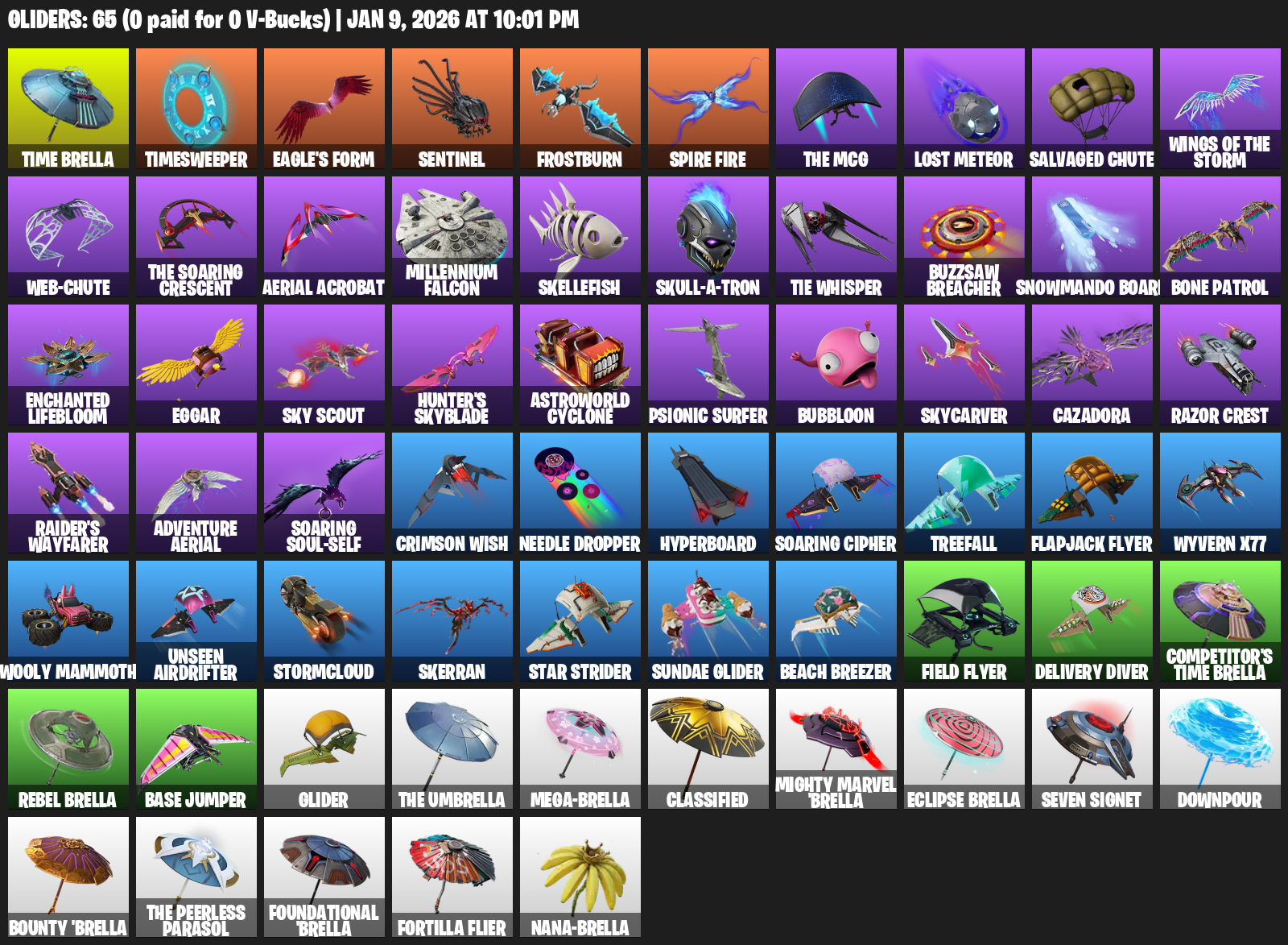 Time Brella, Timesweeper, Eagle’s Form, Sentinel, Frostburn, Lost Meteor, Salvaged Chute, Aerial Acrobat, Millennium Falcon, Skellefish, Skull-a-tron, TIE Whisper, Buzzsaw Breacher, Bone Patrol