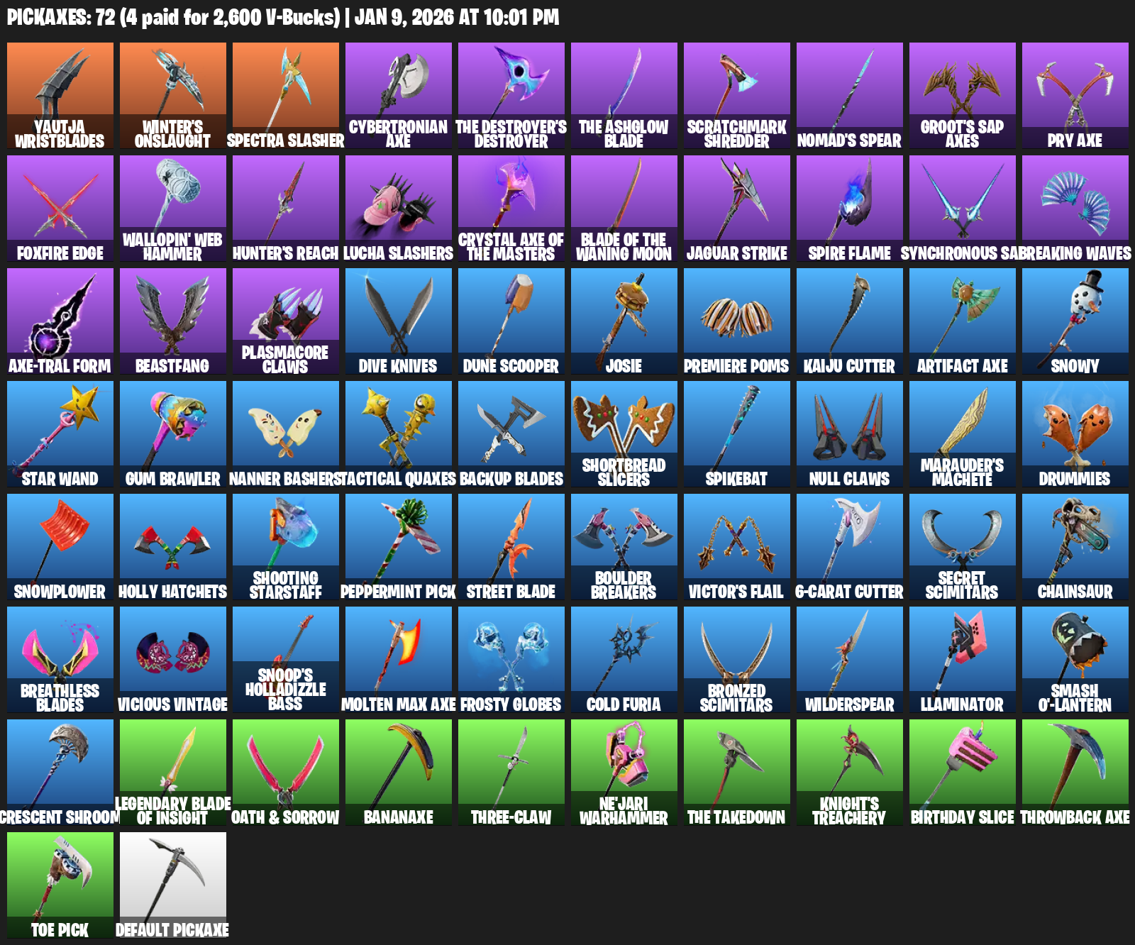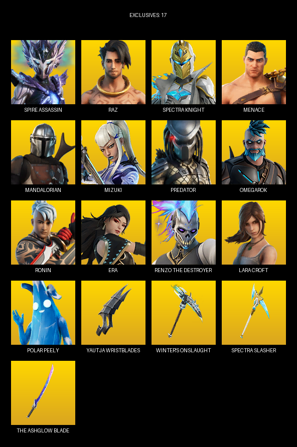 Yautja Wristblades, Winter’s Onslaught, Cybertronian Axe, Scratchmark Shredder, Nomad’s Spear, Groot’s Sap Axes, Foxfire Edge, Wallopin’ Web Hammer, Hunter’s Reach, Lucha Slashers, Jaguar Strike, Synchronous Sai, Breaking Waves