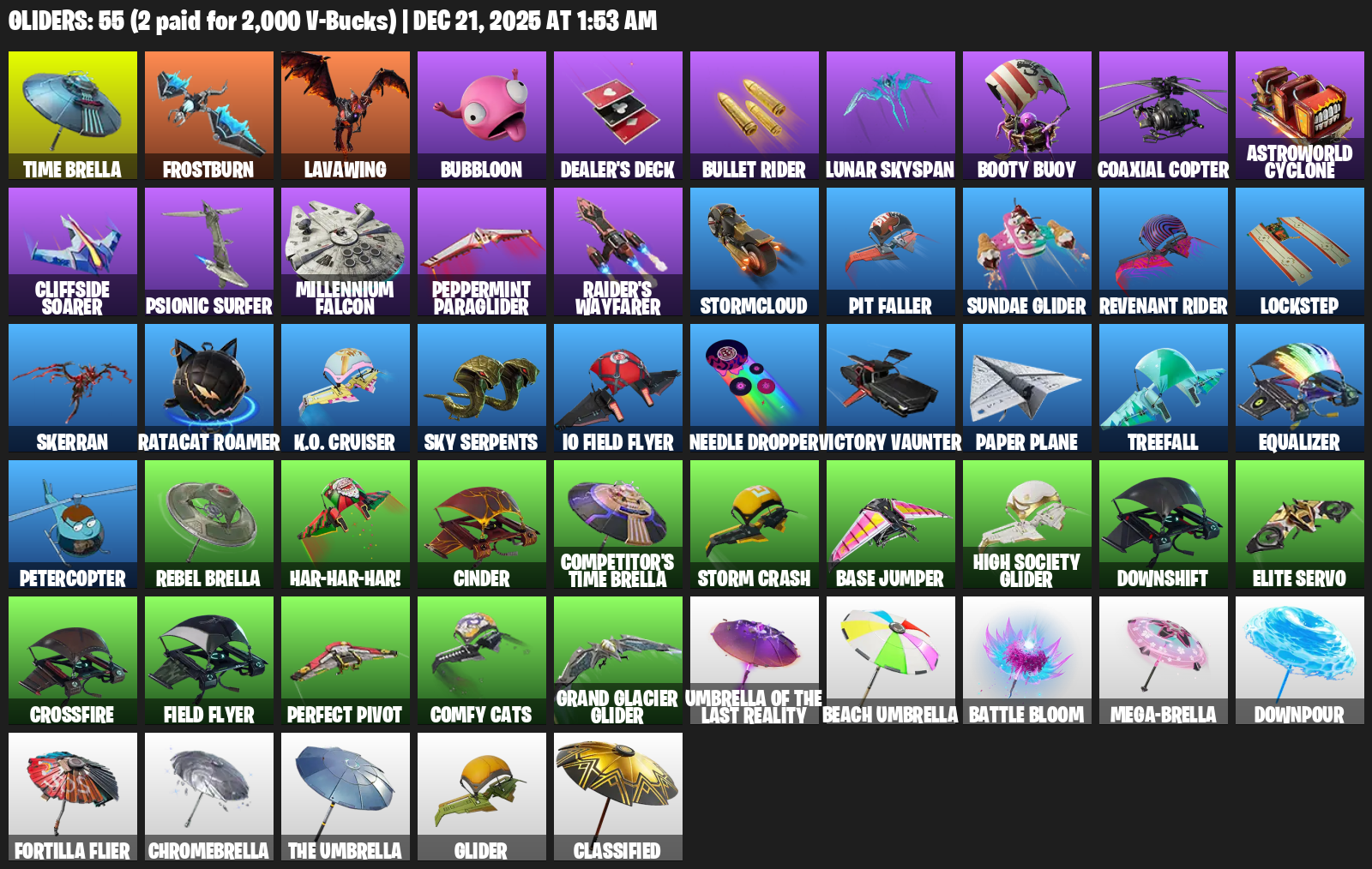 Time Brella, Frostburn, Lavawing, Bubbloon, Dealer’s Deck, Bullet Rider, Lunar Skyspan, Booty Buoy, Coaxial Copter, Astroworld Cyclone, Cliffside Soarer, Psionic Surfer, Millennium Falcon, Peppermint Paraglider, Raider’s Wayfarer, Stormcloud, Pit Faller, Sundae Glider, Lockstep