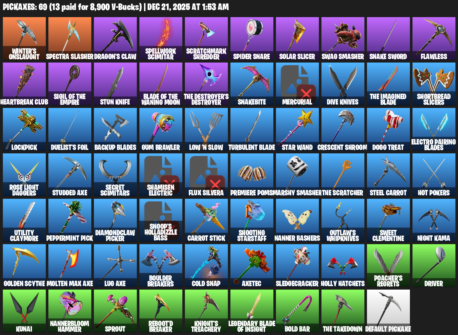 Winter’s Onslaught, Dragon’s Claw, Spellwork Scimitar, Scratchmark Shredder, Spider Snare, Solar Slicer, Swag Smasher, Snake Sword, Flawless, Sigil of the Empire, Stun Knife, Snakebite, Mercurial, Dive Knives, Shortbread Slicers