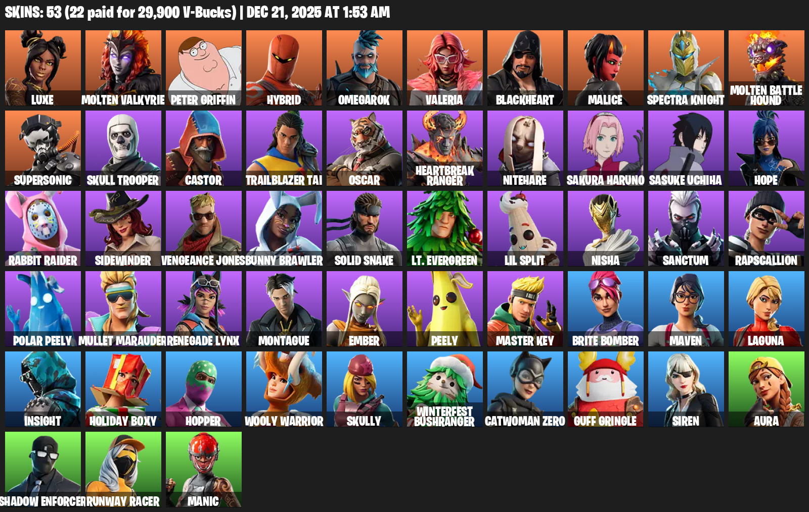 Luxe, Molten Valkyrie, Peter Griffin, Hybrid, Omegarok, Valeria, Blackheart, Malice, Spectra Knight, Supersonic, Skull Trooper, Castor, Trailblazer Tai, Oscar, Heartbreak Ranger, Nitehare, Sakura Haruno, Sasuke Uchiha, Hope