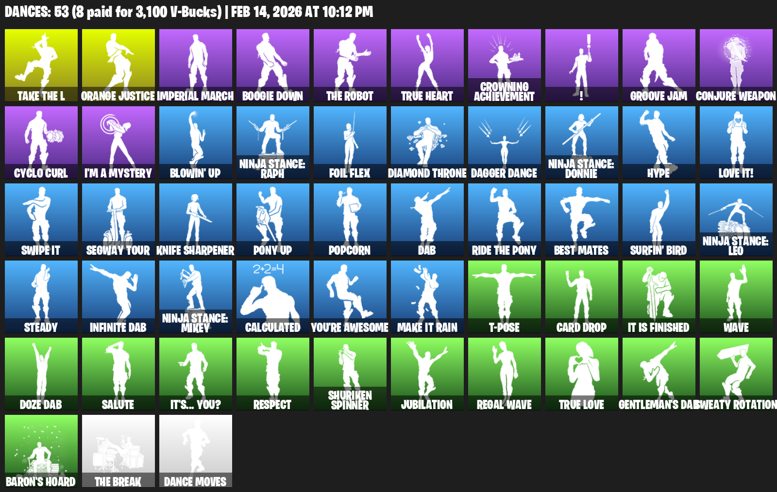 Orange Justice, Imperial March, Boogie Down, True Heart, Crowning Achievement, !, Groove Jam, Conjure Weapon, Cyclo Curl, I’m a Mystery, Blowin’ Up, Ninja Stance: Raph, Foil Flex, Diamond Throne, Dagger Dance, Hype