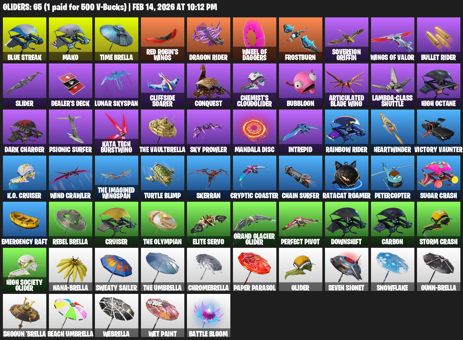 Mako, Time Brella, Red Robin’s Wings, Frostburn, Bullet Rider, Slider, Dealer’s Deck, Lunar Skyspan, Cliffside Soarer, Conquest, Chemist’s Cloudglider, Bubbloon, Articulated Blade Wing, Lambda-Class Shuttle, High Octane