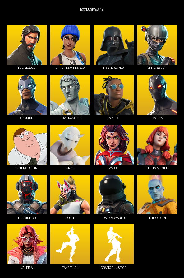 The Reaper, Elite Agent, Omega, Blue Team Leader, Darth Vader, Carbide, Love Ranger, Malik, Peter Griffin, Snap, Valor, Drift, Dark Voyager, Valeria, Gunnar, Stormfarer, Coruscant Guard
