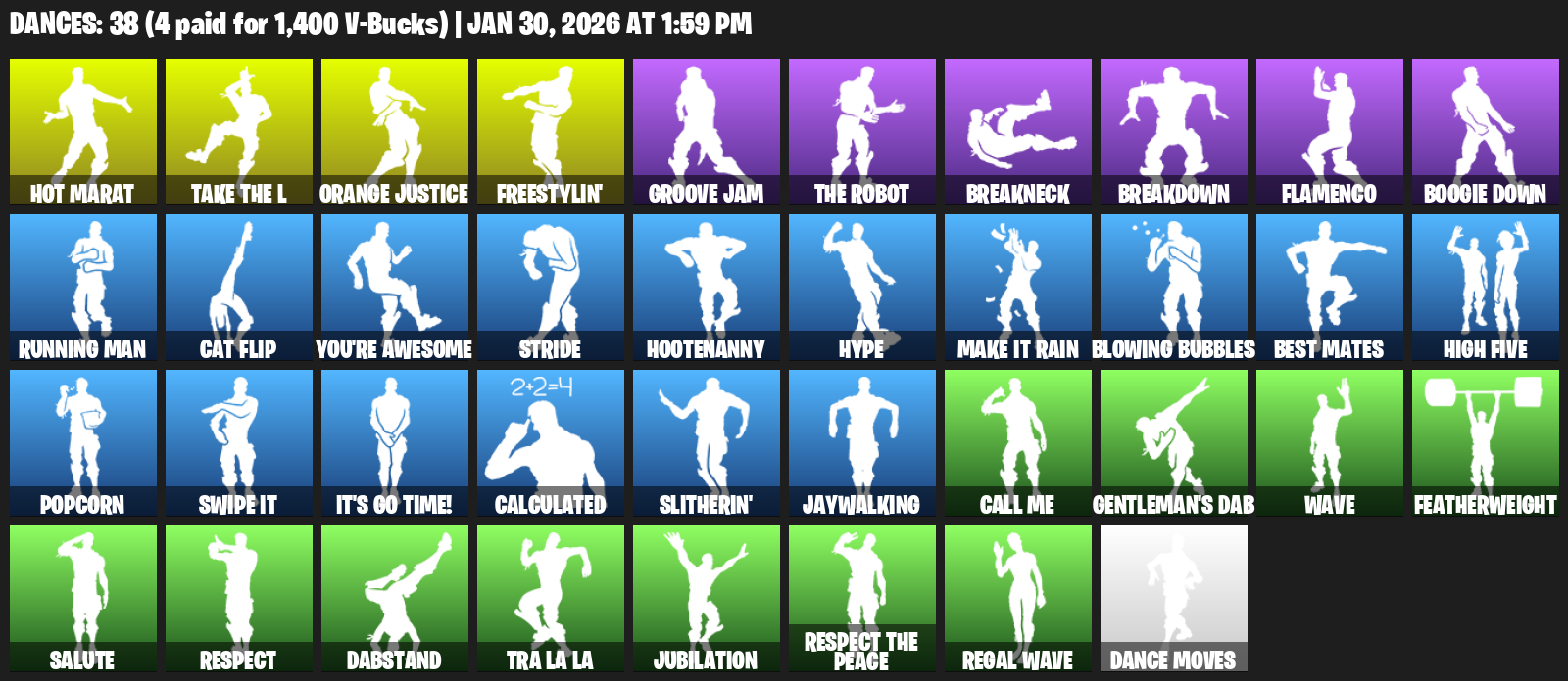 Hot Marat, Orange Justice, Freestylin’, Groove Jam, Breakneck, Breakdown, Flamenco, Boogie Down, Running Man, Cat Flip, You’re Awesome, Stride, Hootenanny, Hype, Make It Rain, Blowing Bubbles, Best Mates, High Five
