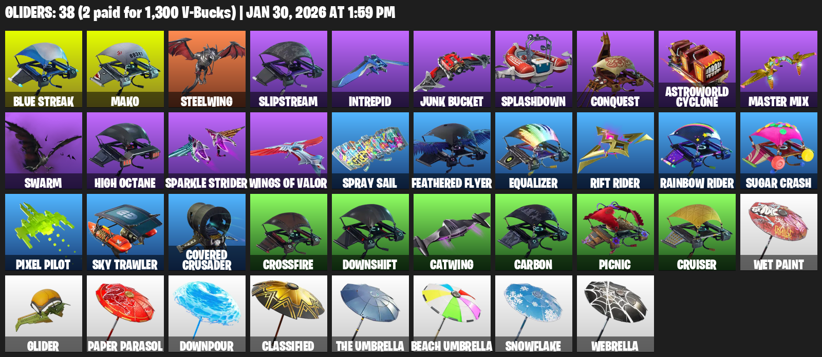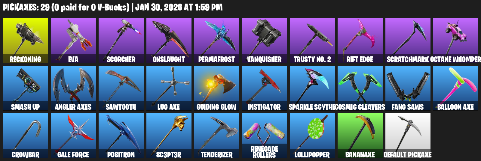 Reckoning, EVA, Scorcher, Onslaught, Permafrost, Vanquisher, Trusty No. 2, Rift Edge, Scratchmark, Octane Whomper, Smash Up, Angler Axes, Sawtooth, Lug Axe, Guiding Glow, Instigator, Sparkle Scythe, Cosmic Cleavers, Fang Saws