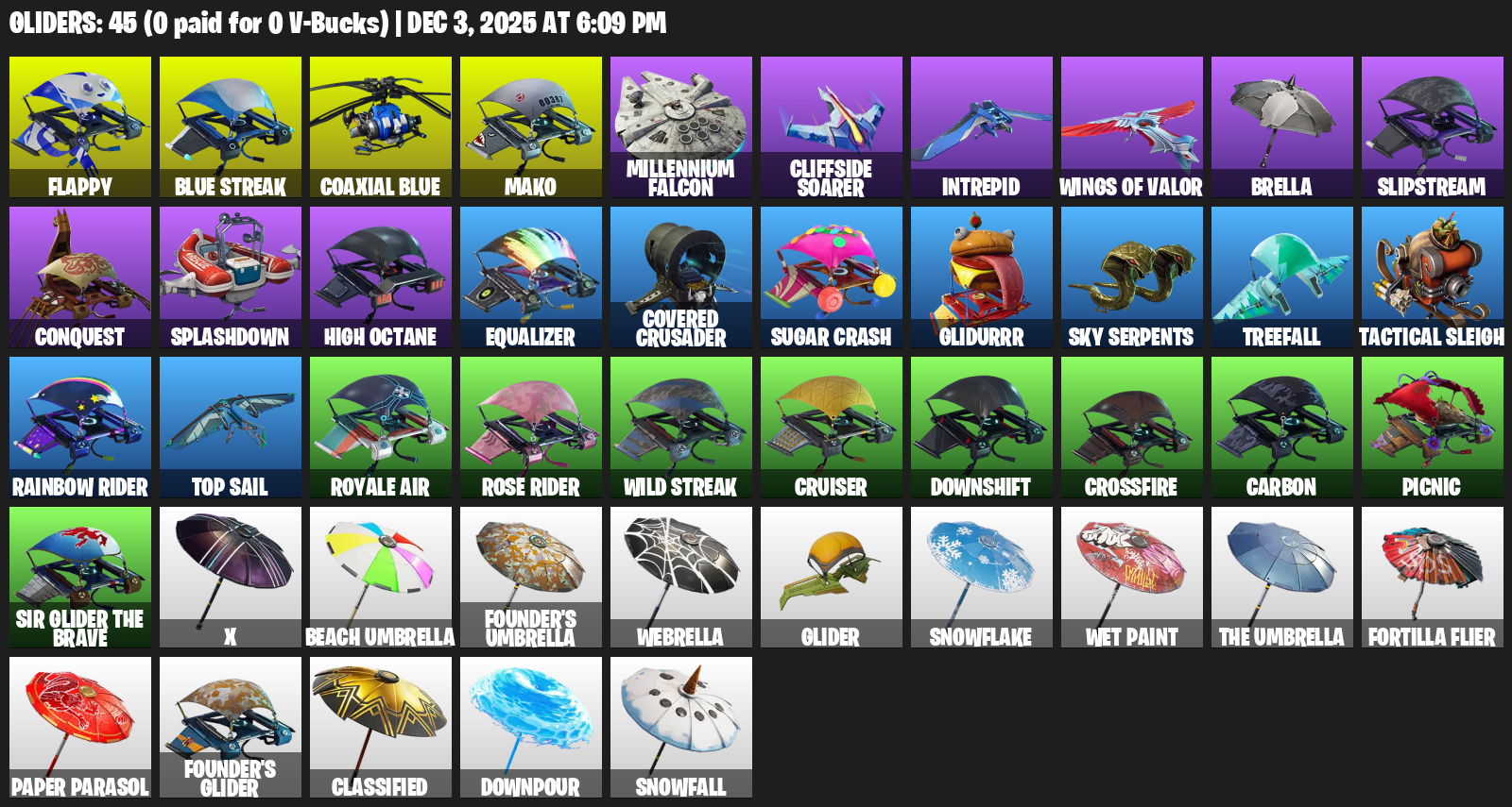 Mako, Flappy, Millennium Falcon, Cliffside Soarer, Intrepid, Wings of Valor, Brella, Slipstream, Conquest, Splashdown, High Octane, Equalizer, Covered Crusader, Sugar Crash, Glidurrr, Sky Serpents, Treefall, Tactical Sleigh