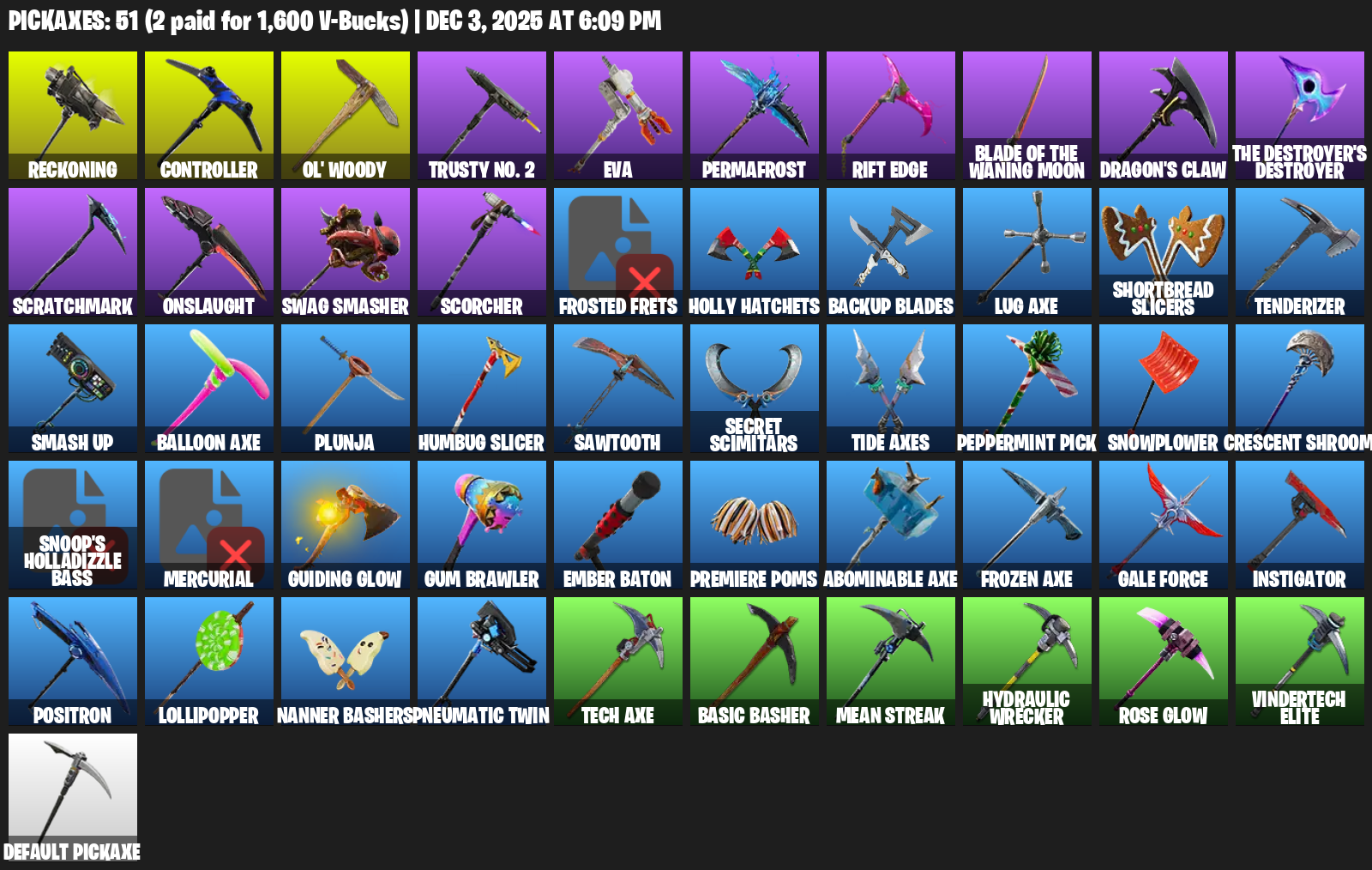 Reckoning, Controller, Ol’ Woody, Trusty No. 2, EVA, Permafrost, Rift Edge, Dragon’s Claw, Scratchmark, Onslaught, Swag Smasher, Scorcher, Frosted Frets, Holly Hatchets, Backup Blades, Lug Axe, Shortbread Slicers, Tenderizer