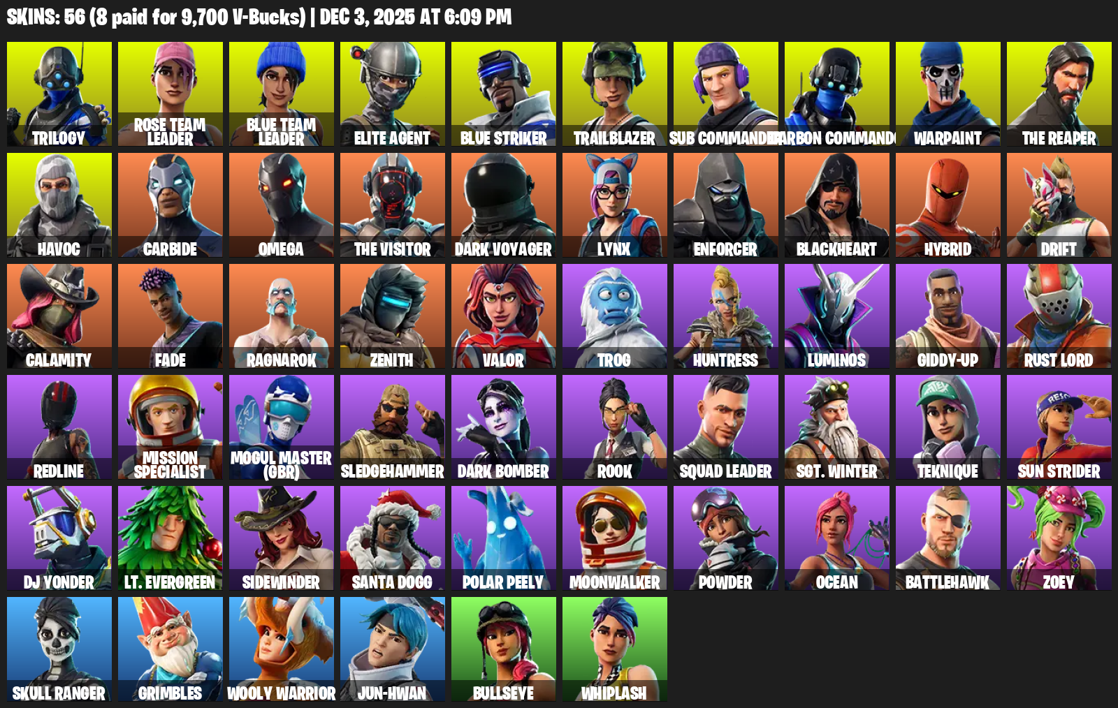 Elite Agent, The Reaper, Omega, Trilogy, Rose Team Leader, Blue Striker, Trailblazer, Sub Commander, Carbon Commando, Warpaint, Havoc, Carbide, Dark Voyager, Lynx, Enforcer, Blackheart, Hybrid, Drift