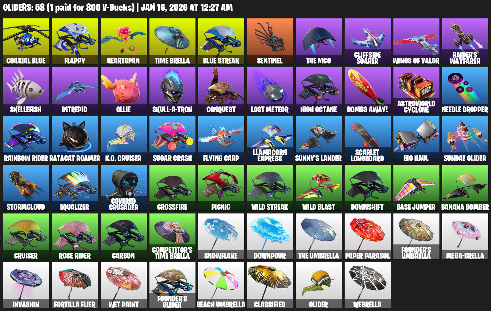 Flappy, Heartspan, Time Brella, Sentinel, Cliffside Soarer, Raider’s Wayfarer, Skellefish, Intrepid, Ollie, Skull-a-tron, Conquest, Lost Meteor, High Octane, Bombs Away!, Astroworld Cyclone, Needle Dropper