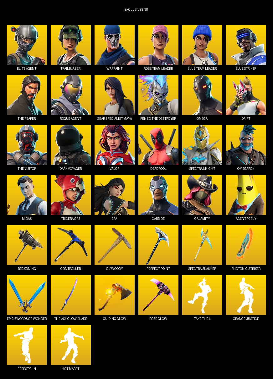 Elite Agent, The Reaper, Gear Specialist Maya, Omega, Trailblazer, Warpaint, Rose Team Leader, Blue Striker, Drift, Dark Voyager, Valor, Deadpool, Spectra Knight, Omegarok, Midas, Tricera Ops